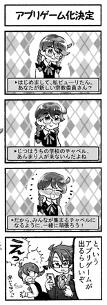 ゲームの舞台となるのは、ピューリたんたちが通う聖エクレシア学院。プレイヤーは「宗教委員」の一人として、チャペルでの礼拝により多くの生徒たちを集めようと知恵を出し合い、「敬虔(けいけん)値」を高めていきます。出現するピューリたんとその仲間たち(「改革派くん」「カトリックくん」などのメインキャラ)と仲良くなると、「交換日記」として4コマ漫画のバックナンバーが読めるなど、ファンにはうれしい特典が…!!