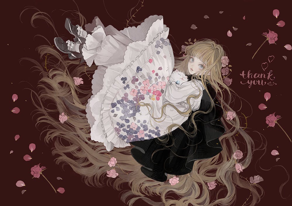 薔薇の魔女を描くのは、儚げな美少女と幻想的な世界観を得意とする、ねこ助さん。老若男女問わず惹き込まれる、美しく繊細なタッチのイラストが印象的なクリエイターです。また、動物もとても魅力的に描き、生き生きとしたその表情やしぐさに心を奪われたファンも数多くいます。
