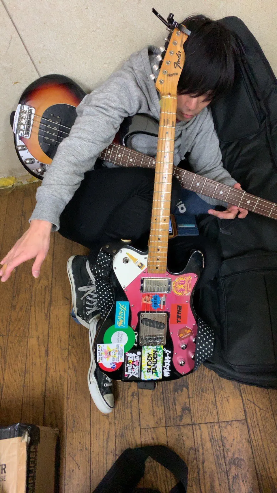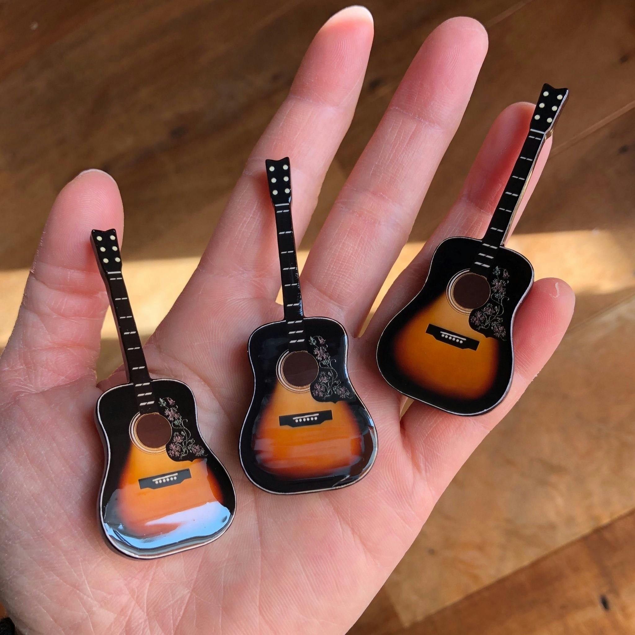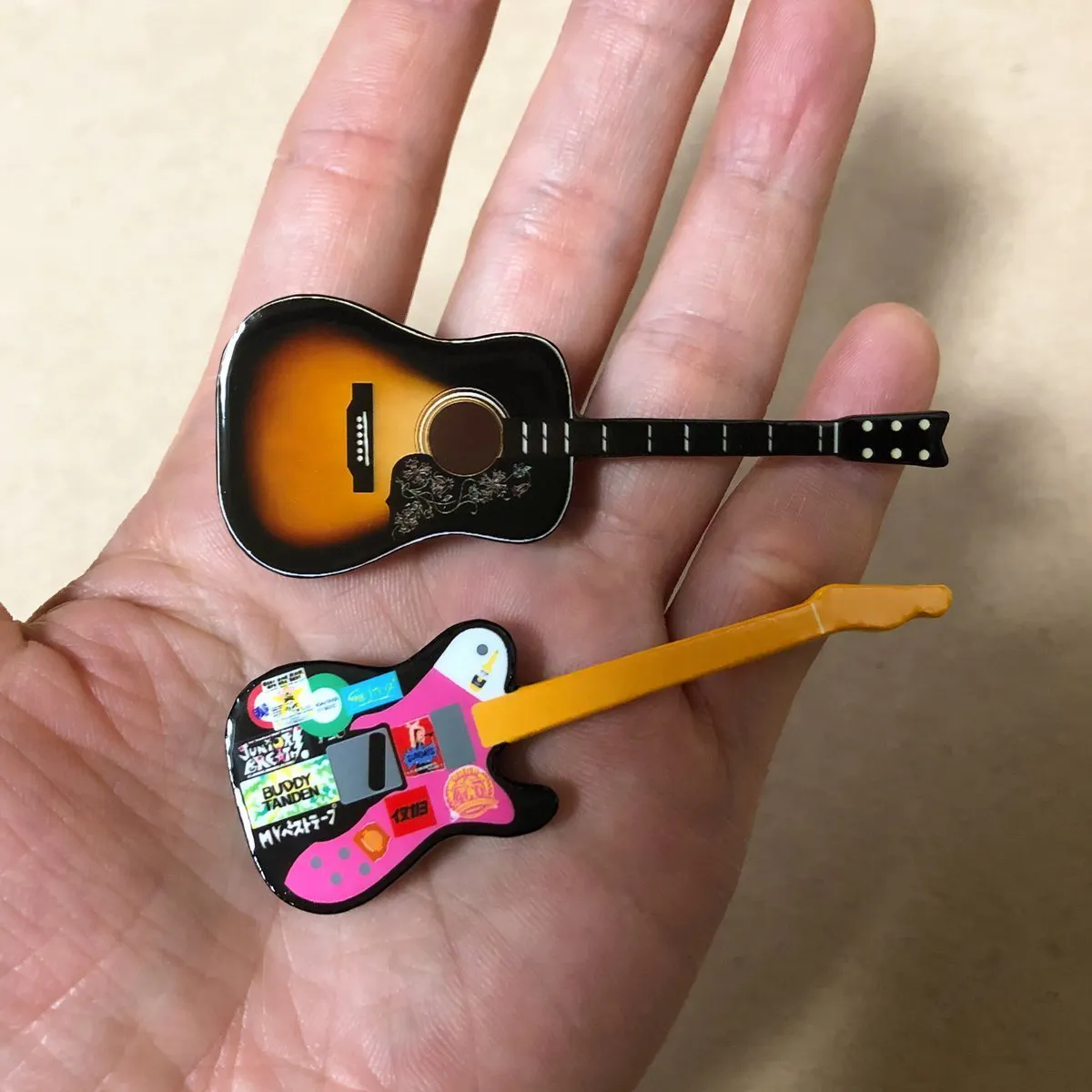 こちらのアコースティックギターか、下の画像で、うちのベースが白目むいてすたんどになってくれてる現在JUNIOR BREATHのステージで活躍しているテレキャスター「パッチ」のモチーフにしたブローチを提供していただきました!お得な2種セットも展開します。