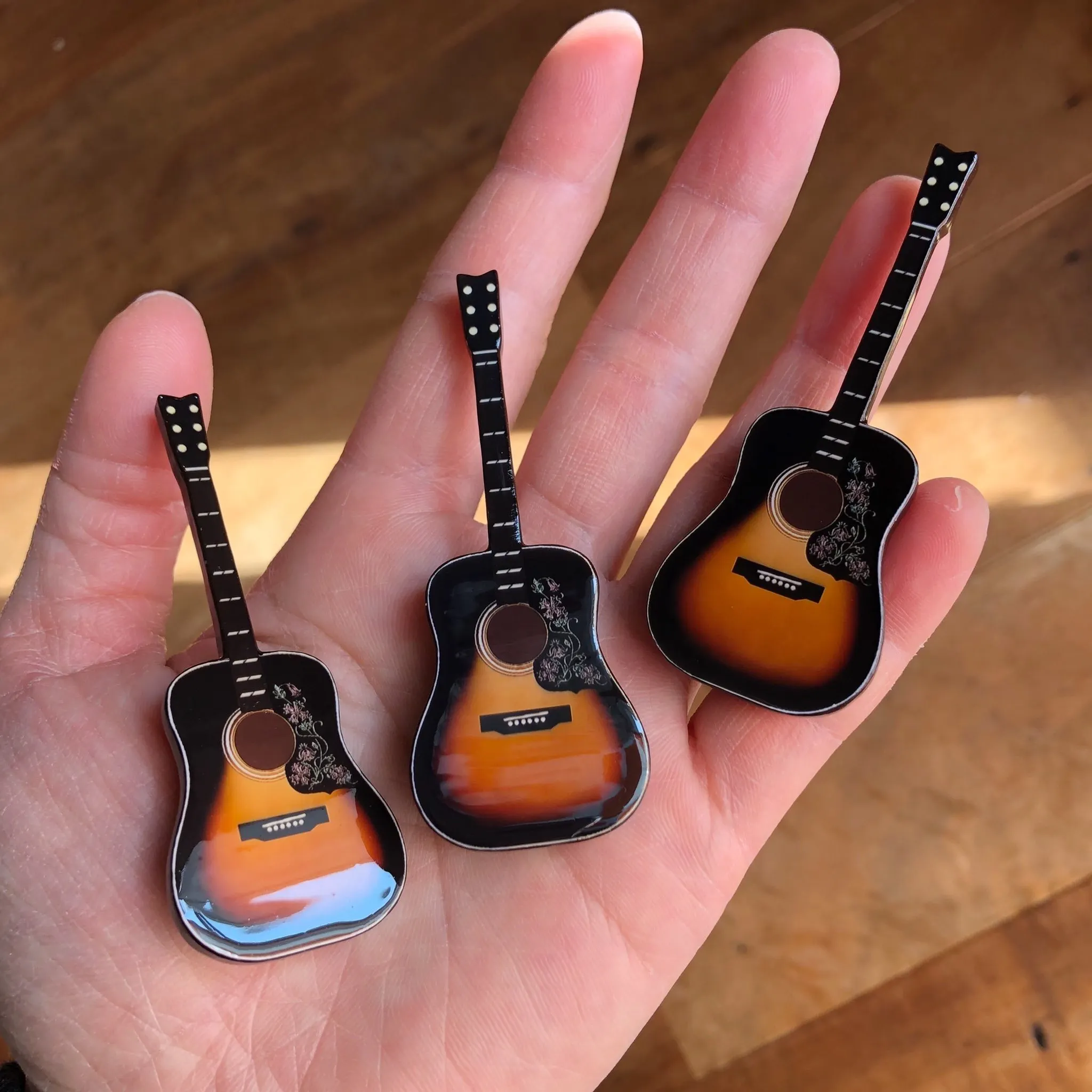 音楽をテーマにギターやアンプのモチーフでアクセサリーを作っているアーティスト。自身もミュージシャンで僕とはもうかなり長い付き合いになります。上の画像のアコースティックギター。これ、僕がソロライブでずっと使っているギターがモチーフなんです。