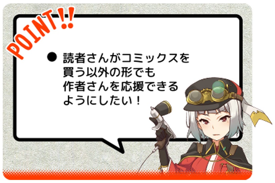 読者のみなさんにとっては、作家さんの生み出した1枚のイラストにも支援、応援ができるような仕組みを目指します。単行本を買う以外にも、作品を読むことはもちろん、グッズを購入することで作家さんを応援・支援できるという、選択肢を増やすことを目標にしていきます。