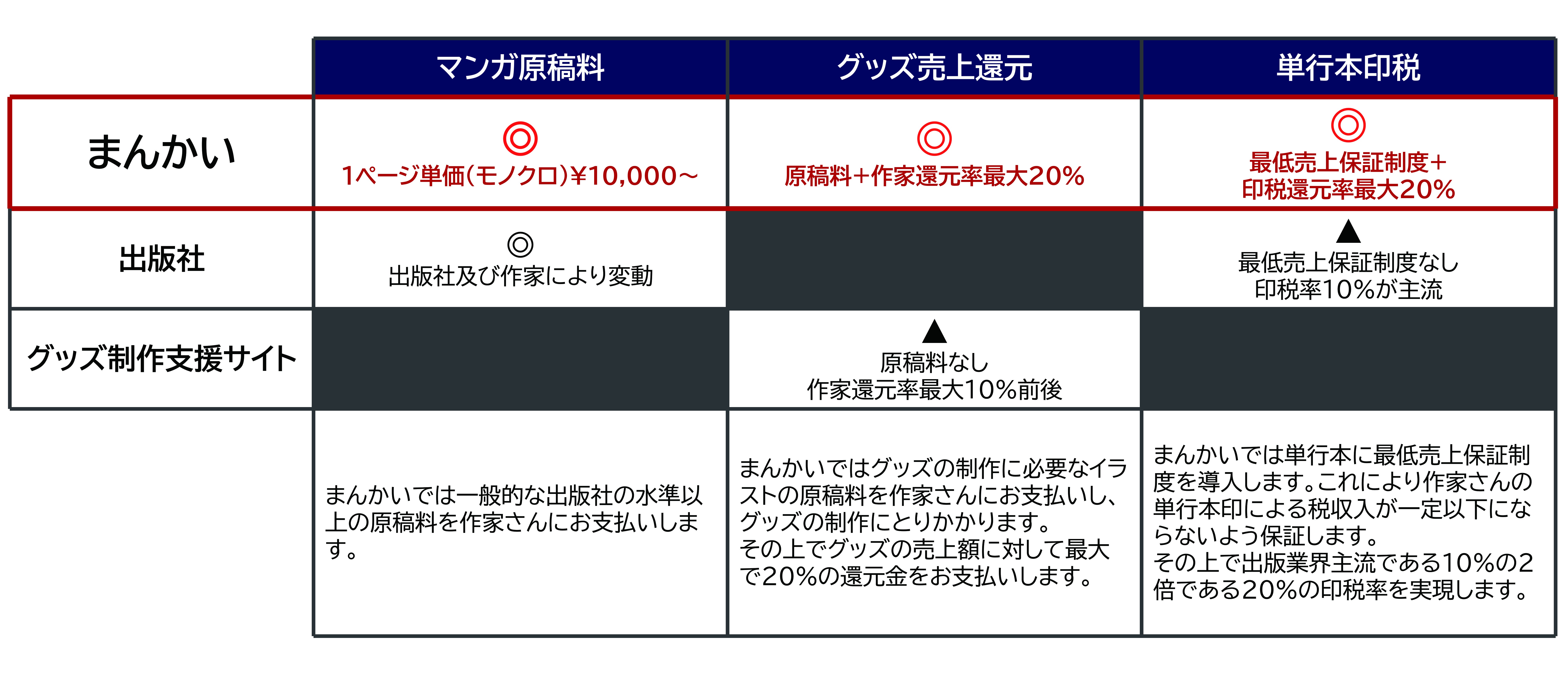 一部の漫画配信サービスで完全無料化を謳っているものもありましたが、継続してサービスを提供し続けることができていません。これらのほとんどが広告収入及び、自社コンテンツの宣伝広告費としてマンガを制作していると思います。「コミック まんかい」ではこれまでの出版業の「コミックスの売り上げ」に加え、「グッズの売り上げ」を元に作家さんにお支払いする原稿料をまかなっていく予定です。