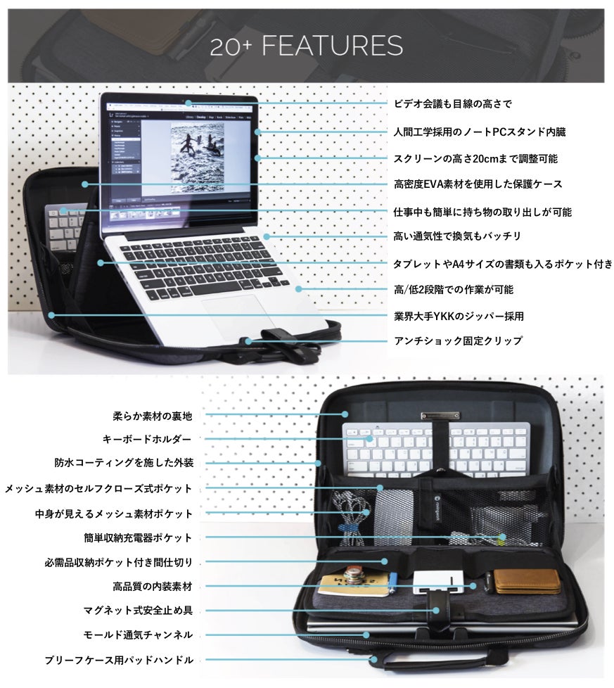 特許出願中のスタンド機能搭載ノートPCバッグです。人間工学的に正しい姿勢でのPC作業が可能に。だから首や腰、背中、肩への負担も軽減されます。