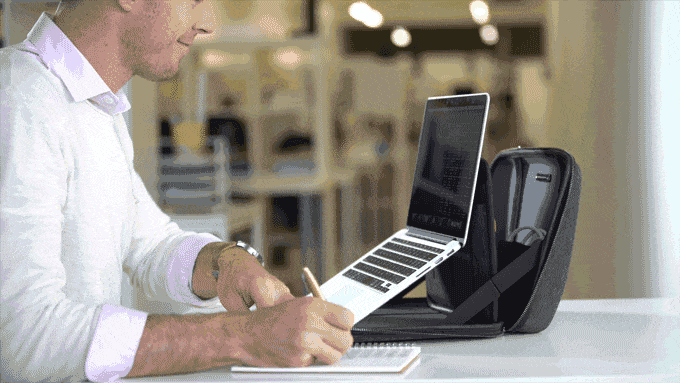 超軽量ノートPCスタンドを内蔵したMOBICASEは、数秒でセッティング完了。姿勢の改善を促し、どんな場所での作業でも腰や背中の痛みを防止します。オフィス、空港、カフェ、ホテル、自宅など、場所を問いません。