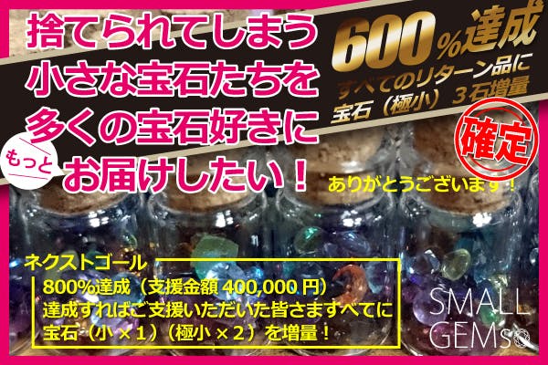 2019/04/05 17:02今回のクラウドファンディングでも、おかげさまで私たちの予想をはるかに超えるたくさんのご支援を、前回よりも早いペースでいただいています。私たちのチカラだけでは、これほどまでに小さな宝石たちのミチを切り拓くことは決してできなかっただろうと思っています。ご支援いただきました皆さまのおかげで、数多くの小さな宝石たちを世に出すことができそうです。ご支援いただきました皆さまのおかげで、売上にならずに困っている宝石商の方のお力になれそうです。ご支援いただきました皆さま、このプロジェクトを見守ってくれた皆さまのおかげで、小さな宝石たちの存在を多くの方々に知っていただくことができそうです。本当にありがとうございます。お約束の宝石(小サイズ1石+極小サイズ2石)は、ご支援いただきましたすべての皆さまに、追加させていただきます。600%達成時のものと合わせると、小サイズ1石+極小サイズ5石の増量となります。残り11日!ラストゴール支援金額1000%。目指したいと思います!達成できれば、さらに宝石(中サイズ以上の「ホワイトオパール」1石)を追加させていただきます。ご賛同いただいている宝石商の方が、ぜひこれも皆様にと、ご提供していただきました。もちろん、通常の小さな宝石たちもできる範囲でサプライズ増量もさせていただくつもりです。最後の最後まであたかいご声援をいただけますと幸いです。 もっと見る