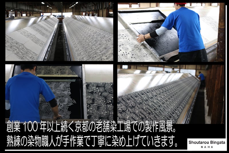 今回「語れるゆかた」を制作するにあたり、多くの方に金城昌太郎氏の作品を手にして欲しいという想いから、どうしても手染めを越えて工場生産になってしまいます。