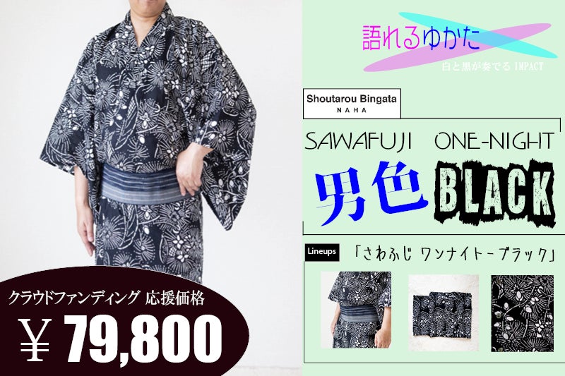 琉球びんがた職人:金城昌太郎氏が、琉球紅型(びんがた)の帯を制作する為に制作した「型紙」にした「さわふじ」の花を、初夏の漆黒の夜に一夜だけ咲き乱れる姿をイメージし、京都の老舗の染工場にて、黒をベースとしたモノトーン調に仕上げました。