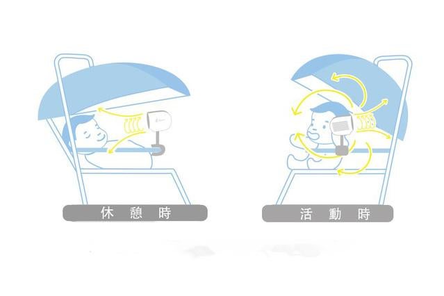 右下図のように、ベビーカーのシートに空気を吹き付けることで、空気の流れが跳ね返り清浄された領域を作り出すことができます。鼻や口に直接空気を送り込む時ほどではありませんが、一定の効果があります。