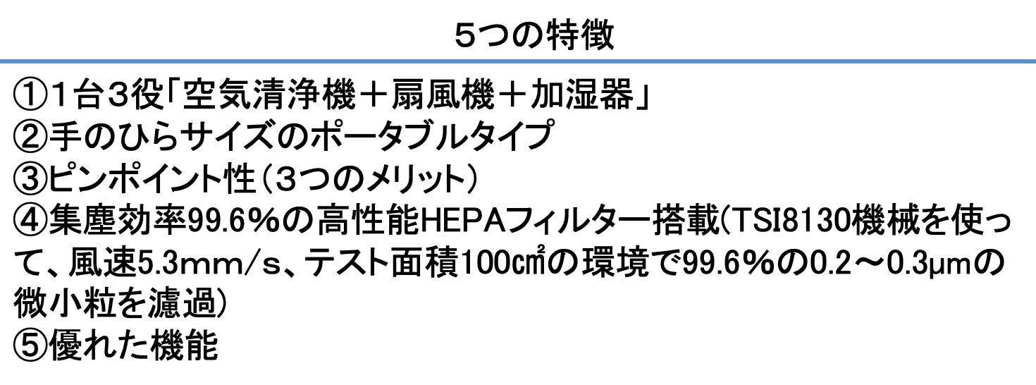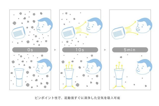 実際に、人が呼吸する時の空気の量はわずか500ccです。小さな空気清浄機はこの500ccのろ過した清浄な空気をユーザーに提供することに集中すべきです。これを行う最も簡単な方法は、ろ過された清浄な空気を集中し、呼吸のホットゾーンである鼻と口のまわりに吹きつけることです。これこそが、「ピンポイント性」です。