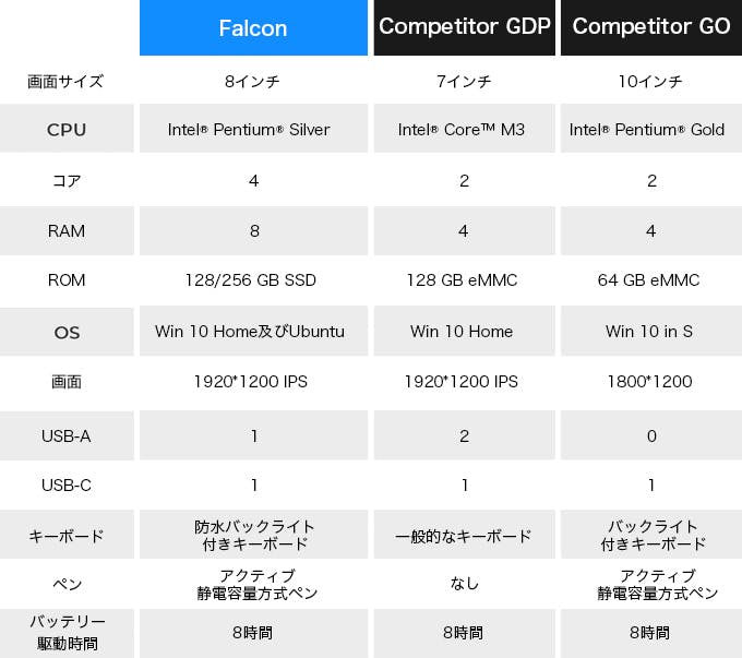 Falconは、まさにこの状況を打破するために設計しました。Falconはポータブルで、パワフル、そして機能的な8インチの2 in 1ノートパソコンです。ノートパソコンとタブレットの双方の利点を生かすため高度な機能が詰め込まれ、それでいて低価格に抑えられています。