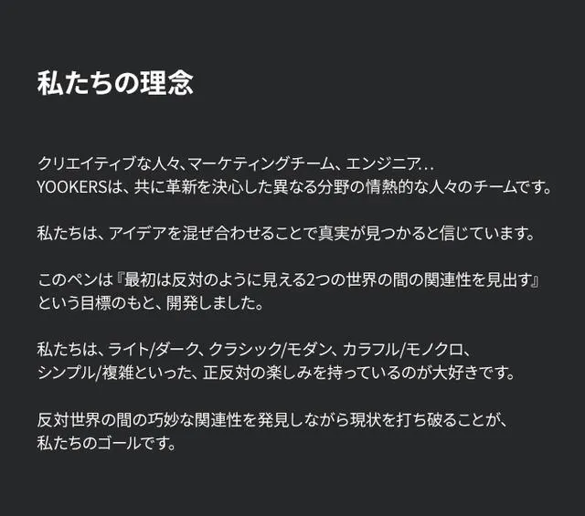 人生における新しい経験は常に価値があり、少なからず強く記憶に残ります。Yookersを初めて使用すれば、あなたは間違いなく深い満足感を感じられるでしょう。私たちの開発したユニークなフェルトペンは、あなたが書く喜びを再発見するのに役立つと確信しています。手紙、メモ、図面、そのすべてが輝き出すのです。Yookersで、あなたの想像力を広げてみましょう。