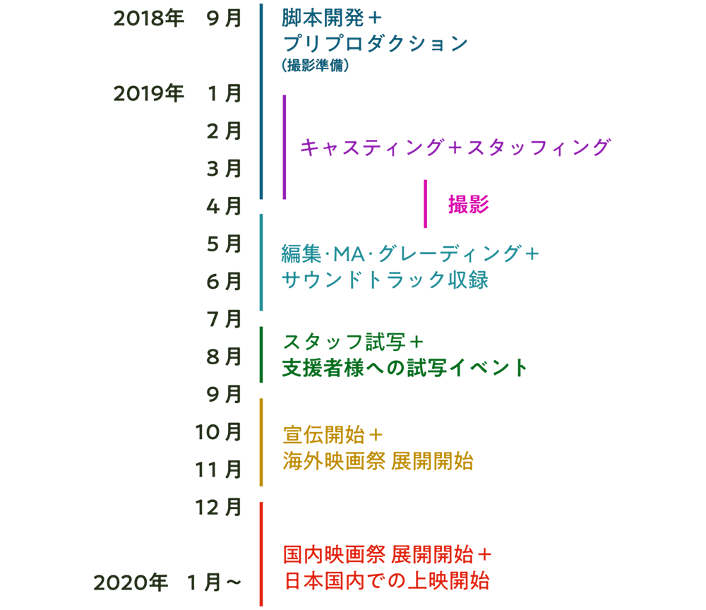 A:主要キャスト3人前後、現場スタッフ25人前後を予定しております。東京・千葉・神奈川で撮影、東京都内でポストプロダクションを行ないます。