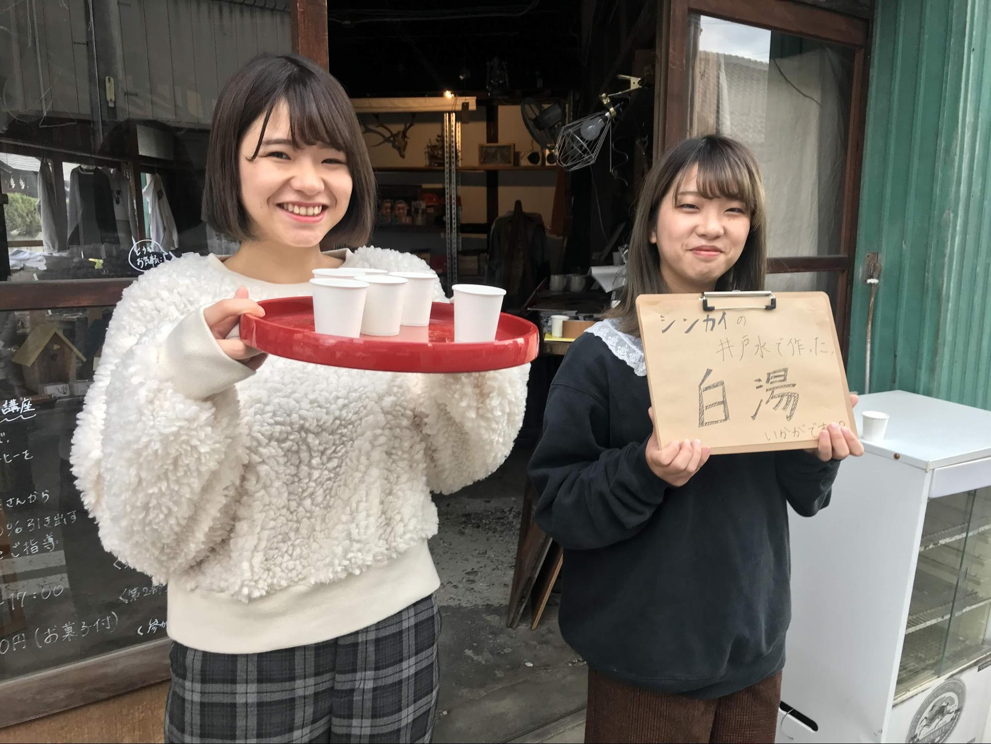 白湯配りは、その名の通り白湯を配るというシンプルな活動。11月から12月までの1ヶ月間、毎朝1時間シンカイの前で配り続けました。初めのうちは怪訝に見れられていた活動でしたが、次第に地域の方におもしろがってもらい、新聞やラジオ、テレビに取り上げていただきました。ちいさな活動ながら、多くの方にシンカイのことを知っていただくきっかけとなりました。今まで知り合うことのできなかった高校生が足を運んでくれるようになったも大きな成果です。