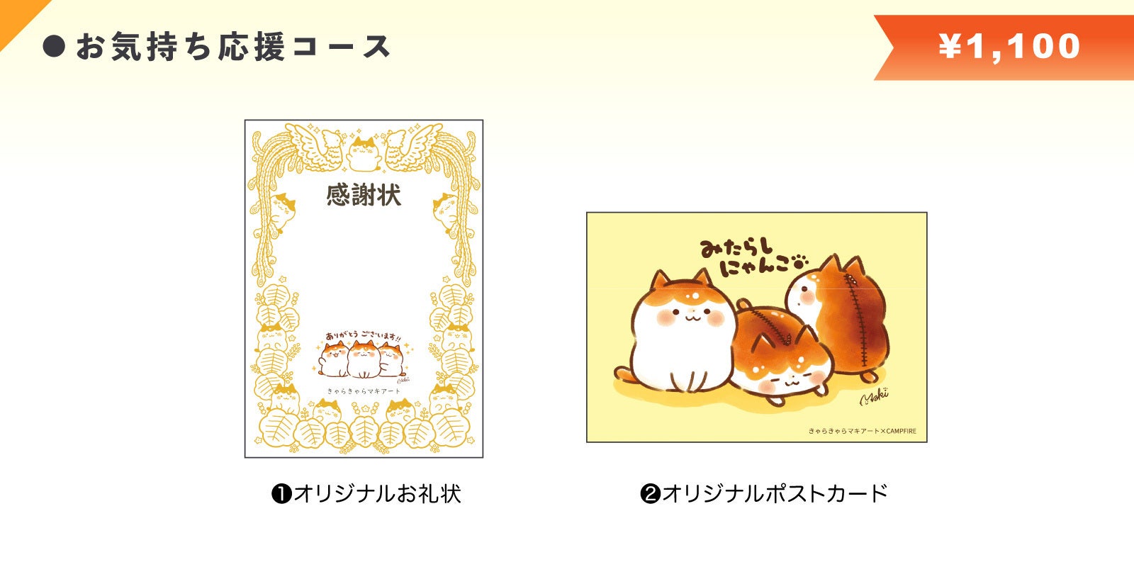 今回のクラウドファンディングで商品化される「みたらしにゃんこペンケース」と、お気持ち応援コース同様のオリジナルポストカード1枚、感謝の気持ちを込めたオリジナルお礼状をお届けいたします。また、オリジナルステッカー各2枚 計4枚セットもお送りいたします。