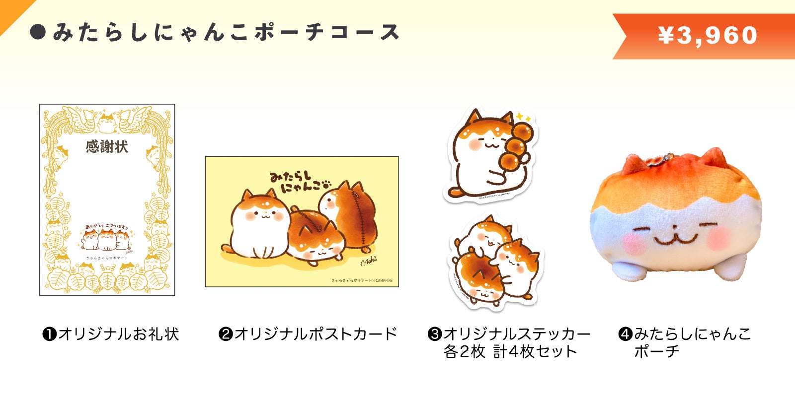 今回のクラウドファンディングで商品化される「みたらしにゃんこポーチ」と、お気持ち応援コース同様のオリジナルポストカード1枚、感謝の気持ちを込めたオリジナルお礼状をお届けいたします。また、オリジナルステッカー各2枚 計4枚セットもお送りいたします。