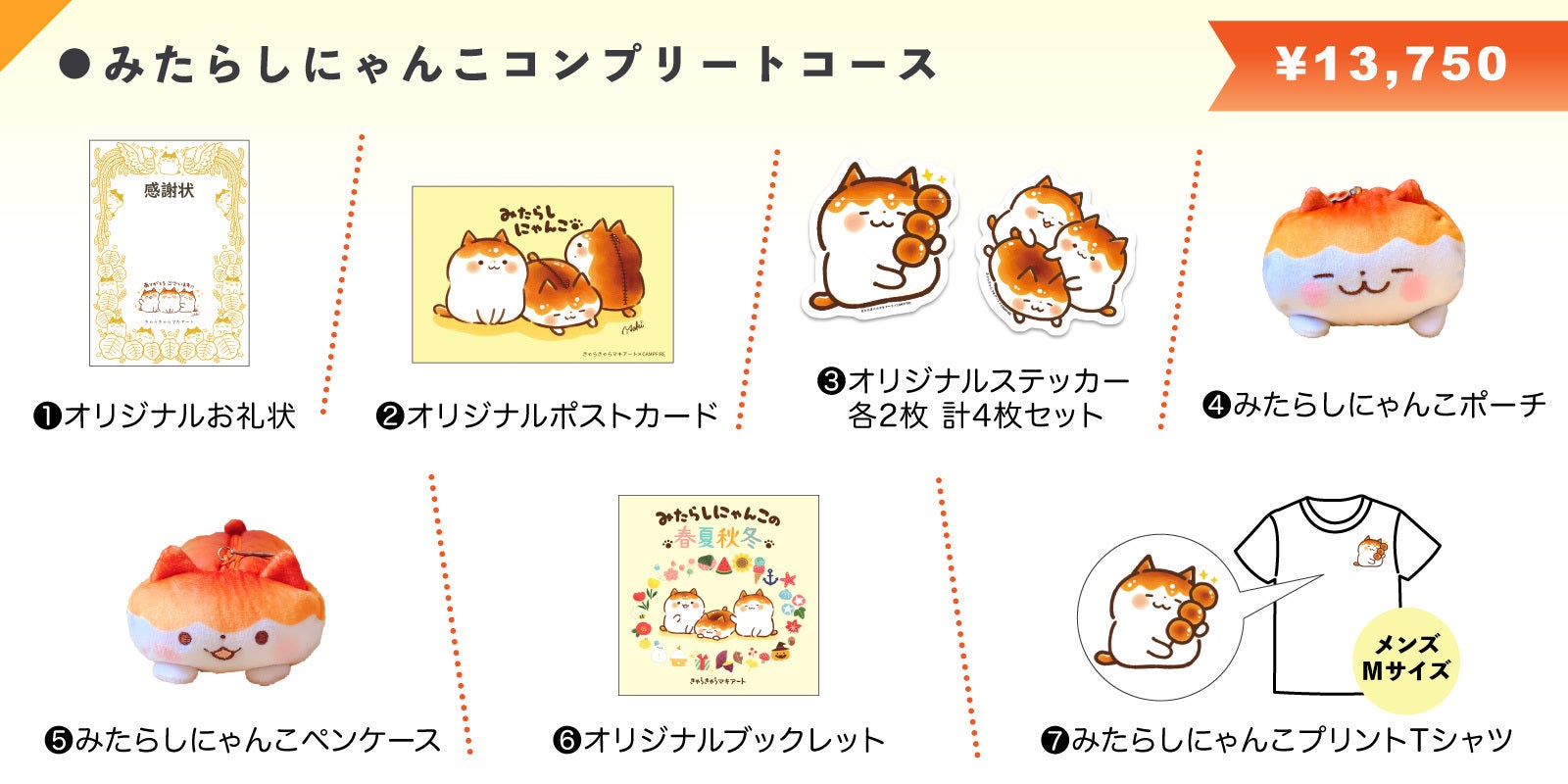 ファン必見のコースです。本プロジェクト限定の「みたらしにゃんこプリントTシャツ」とみたらしにゃんこポーチ&ペンケースコースと同様の内容をお届けいたします。