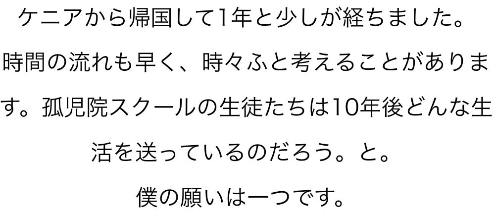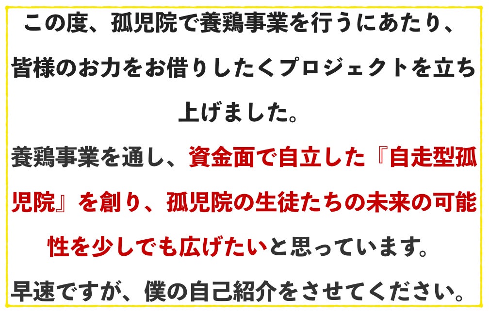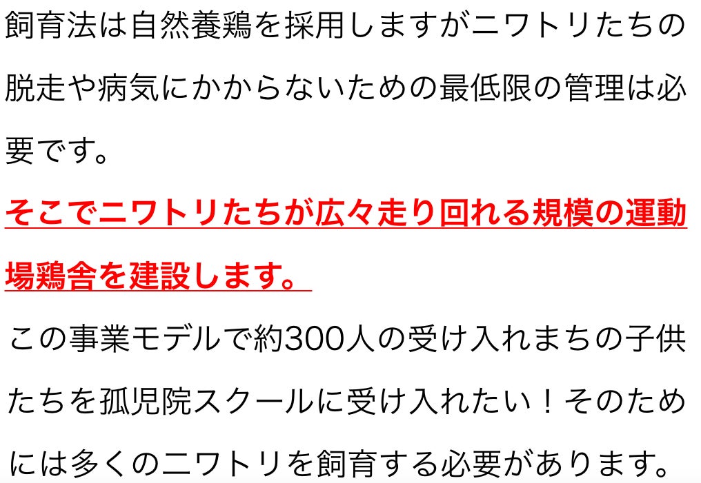 2019/11/20 14:54いつも西原総司を応援してくださりありがとうございます。11月も終わりに差し掛かり気温も冷え込み日本の気象予報を見ていると、猛暑続きのケニアにいても日本の冬の訪れを感じています。先日、全てのリターン品を発送させていただきました。たくさんの方に受け取りのご連絡をいただき感謝の気持ちでいっぱいです。本日は皆様にお伝えしたいことがあり更新いたしました。リターン品の発送も終わり同封された手紙を読んでくださった方も多くいらっしゃるかと存じますが、手紙を書かせていただいていた時期と現在の養鶏事業の現状が大きく異なり、FBでは近況報告を先月にさせていただきましたが今回この場を借りて改めて、今年の6月からスタートした孤児院を支援するためのプロジェクトについて応援してくださってる皆さまにお話できればと思い、養鶏事業の現状、今後のことを綴らさせていただきました。長くなりますが最後まで読んでいただけると幸いです。養鶏事業につきまして結論から申しますと、卵を孵化させるまでに至らず食肉用として今月全てのニワトリを出荷しました。養鶏事業当初の計画では卵を孵化させ、孵化させた卵を生産地で販売するという計画でした。食肉としてではなく卵として養鶏事業を進めることを選んだ理由は、ニワトリの産卵期間の間、継続的に孤児院に売り上げを寄付することができるためです。食肉養鶏ではニワトリが出荷できるサイズになるまで売り上げが立たないので孤児院支援において持続的ではないと判断した上での選択でした。それなのになぜ食肉として出荷したのかを説明させていただきます。6月に鶏舎の建設がスタートし7月の頭に250羽のニワトリを購入しました。そこまでは順調だったのですが8月に産卵期まで1ヶ月を日控えていたニワトリが感染症に感染しました。具体的にはニワトリのお腹の中で臓器に菌が感染し、臓器不全や体内にウミが溜まってしまうなどの症状がありました。明らかに体に異変のあるニワトリはすぐに隔離し経過を見ていましたが数日後に全羽亡くなりました。体に異変のないニワトリも感染の疑いがあるので養鶏の専門家などに相談し薬を処方してもらいました。しかし感染症は次から次へと広がっていき100羽以上のニワトリが死にました。薬を変えても効果はなく専門家もお手上げ状態でした。一見見た目に変化はなく元気だったニワトリが次の日の朝になると鶏舎で死んでいるという状況が続きました。幸い感染を逃れたニワトリもいましたがそれらのニワトリも産卵期をとうに過ぎても産卵が始まらず10月を期限とし様子を見ていましたが産卵は行われませんでした。おそらく感染症がなんらかの影響を与えており不妊となっていたと見られます。そして養鶏場を一緒に管理している現地人パートナーと相談し、ニワトリが感染して死ぬまえに食肉として販売することにしました。僕とパートナーにとっても全く予想外の事態であり苦渋の決断でしたがこれ以外に選択がありませんでした。本当ならこの時期には『産卵しました』と、ご報告できる予定だったのですが、11月末に約100羽全てのニワトリを売り切りました。半年前まで鳴き声が聞こえていた鶏舎もカラになりました。今回このような終わり方になってしまい本当に悔しいです。一羽また一羽と死体を土に埋める作業が1番精神的にきつかったです。二度と同じ失敗を繰り返さないために、今回の問題点を整理しまとめました。1 ) 生後3ヶ月のヒナを購入したこと。ニワトリは生後約半年ほどで産卵を始めます。生後間もないヒナを購入すれば半年間全く売り上げのない中、エサやワクチンなどの経費を捻出しなければなりません。さらに孤児院へ寄付ができるまで半年以上かかることを考えた時に、お金も時間もかかりすぎるため、生後3ヶ月のヒナを購入しました。この問題点はヒナの生後3ヶ月間の飼育環境が不透明であったことです。ヒナの段階では抗体を強くするためにワクチンを打ったり、特に衛星環境に注意して飼育しなければいけません。購入前の報告では口頭で全てクリアと双方確認しましたが、今考えると先方が虚偽の報告をした可能性もあり不確かではありました。結果的に抵抗力の弱いヒナを購入してしまった可能性が高いと考えています。1週目から自分で飼育していればこのようなことも起こらなかったと思います。完全に僕の確認不足と早とちりな判断が招いた原因でした。2) ニワトリを会社からではなく個人から購入したこと。ケニアでは会社として養鶏家用にヒナを扱っている会社と個人販売業者が存在します。個人販売業者の方が値下げ交渉など融通が効きます。そのため、会社から購入するより個人から購入する方が安価なため初期投資を抑えれる意味でも個人から購入しました。しかし、感染症が見つかったとき、購入先の販売業者は『育て方が悪かったんだ』と相談にも乗ってもらえず全く対応してもらえませんで