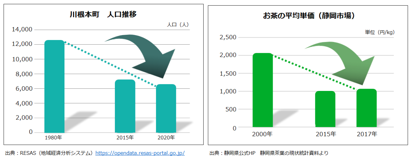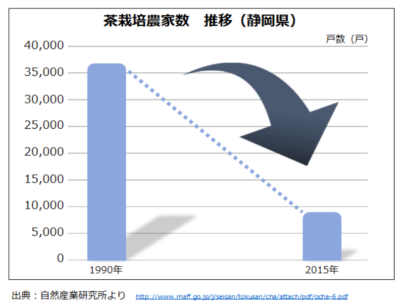 高齢化と過疎化による人口の減少が著しく進み、産業が鈍化。さらに、核家族化によるお茶の間の環境の変化やペットボトル飲料の普及で、主力産業である茶葉の相場がこの15年で半分の価格まで下落し、今までのようにお茶の生産だけで生活することが非常に難しくなってきました。