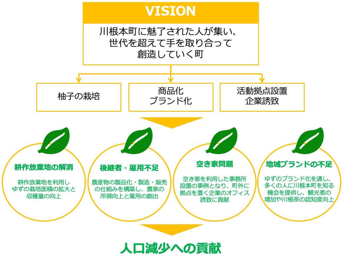 近い将来、人口7,000人に満たないこの川根本町が「お茶と柚子の町」として全国から注目され、活気のある町になることを目指します。
