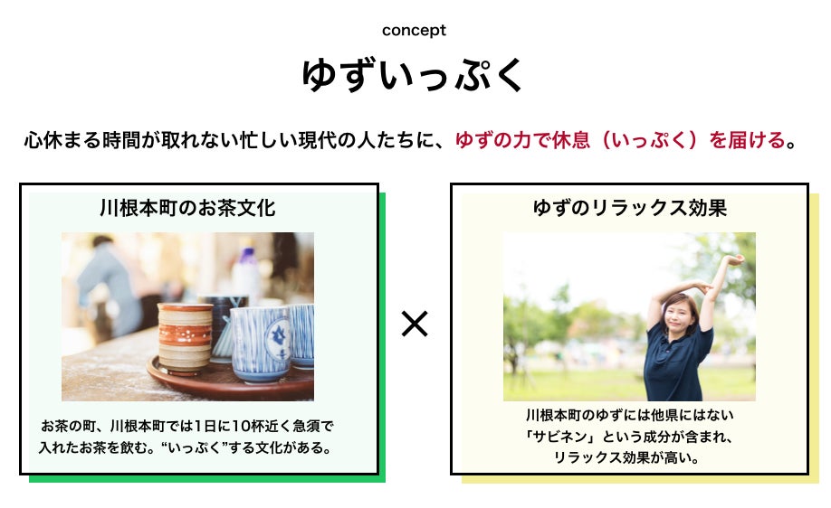 ライフスタイルが多様化し多忙な現代人でも手軽に取れる「いっぷく」の形を、川根本町の柚子を使って実現したい。