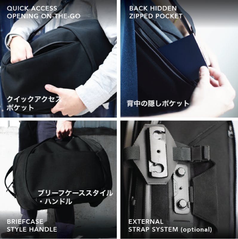スリングモジュールは、ノートPC、iPadなど日常的なアイテムを収納するようにデザインされています。すべての要素が、スマートに収納し、すばやく取り出せるように再定義されています。必要に応じて、スリングモジュールをバックパックから取り外して単体で持ち運ぶことができます。