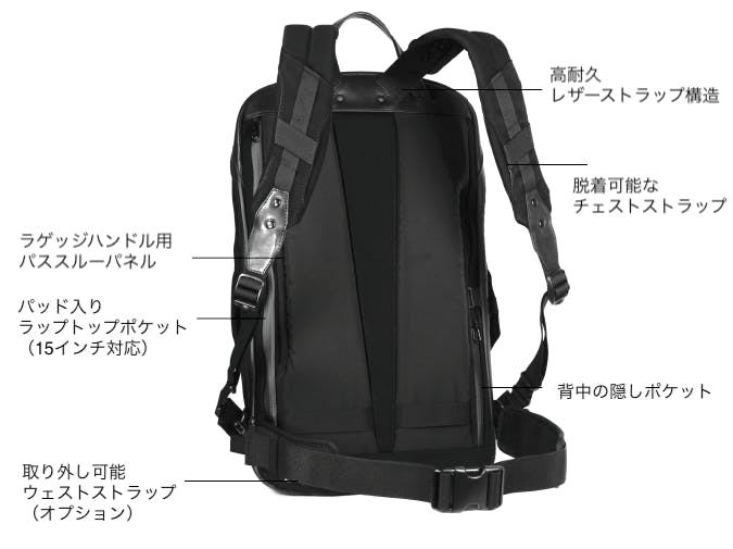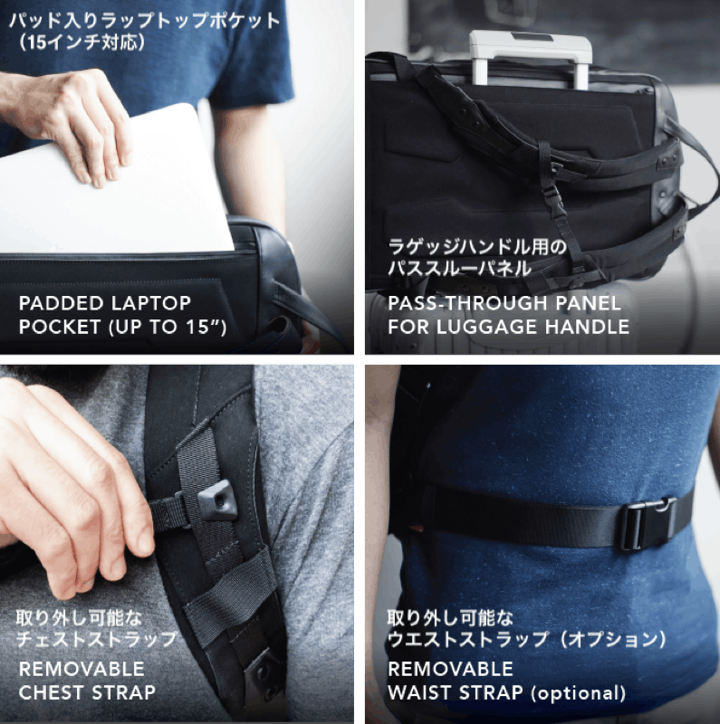 ※従来のバックパックのように、ストラップとバックパックのつなぎ目が壊れたり、ストラップが肩に食い込んで痛むということはありません。