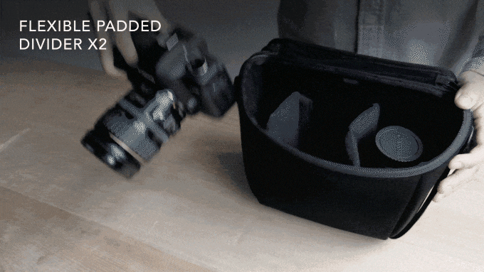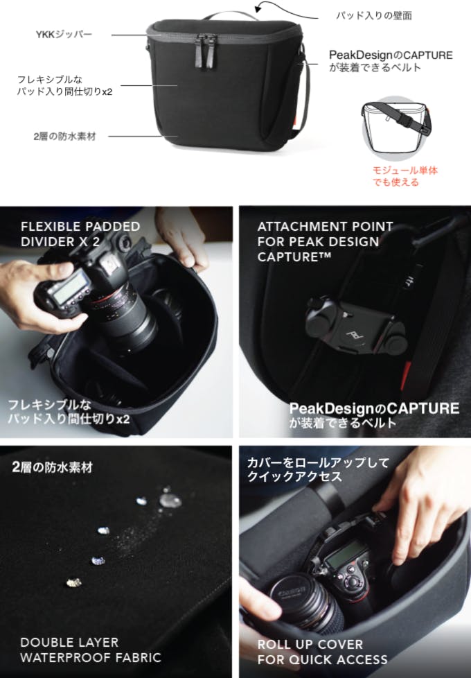 カメラ機材を安全に収納できて、取り外せばショルダーバッグにもなるように設計されたモジュールです。カバーはロールアップして開いたままにすることができ、機材をすばやく取り出すことができます。