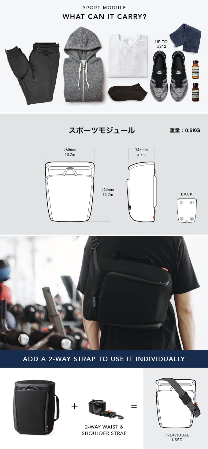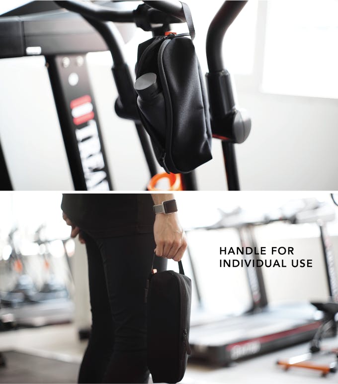 シューズを含むジム用具を入れられるスポーツモジュールと、小物が入るポーチモジュールのセットです。