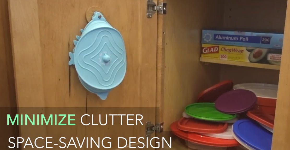 「UniLid」は、重ねたままループで吊るして収納することもできます。キャビネットの中のごちゃごちゃを防げます。