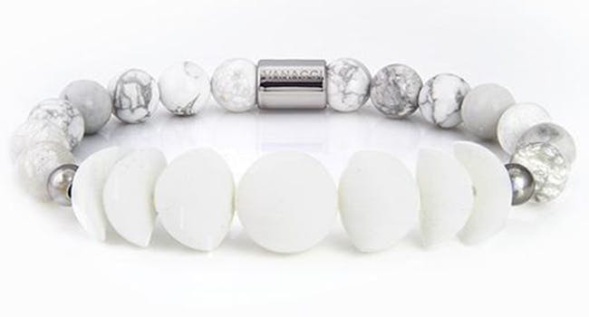 太陽の光に照らされた月のように、白いハウライト石が月の満ち欠けを順番に表現。三日月から半月を辿って満月となり、再び三日月に戻ります。