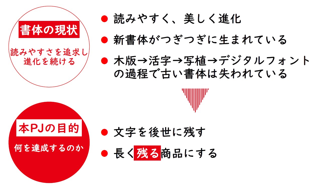 長持ちする商品に印刷すれば、その商品とともに残っていくという仮説を立てました。収集された数百の古書を参考に足掛け20年かけてデジタルフォント化された書体を、長く使われる商品に載せて世に送り出す、こんなアイデアを実践するのに最適なアイテムとは一体何か。そして、”文字を残す”というコンセプトを貫くため残したい文字をすべて使うことができるアイテムは何か。こんな条件がプロジェクトに課せられました。