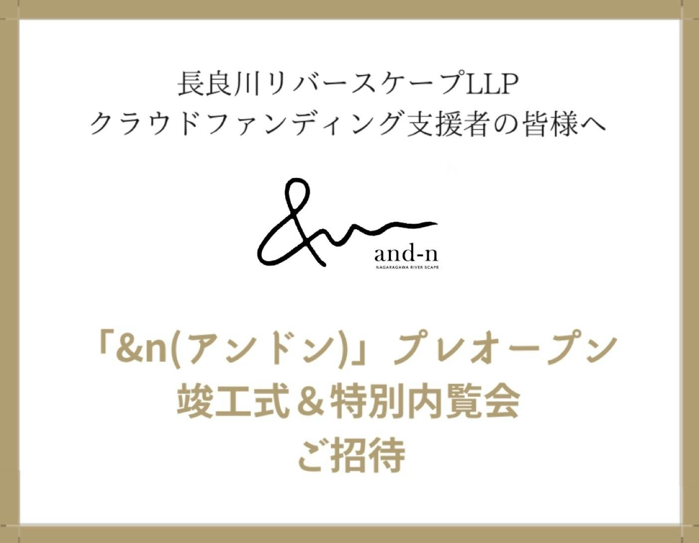 この度、長良川リバースケープLLPへご支援いただきました皆様には、もれなく、グランドオープンに先駆けた『「&n(アンドン)」プレオープン 竣工式&特別内覧会』へのご招待をお送りします。
