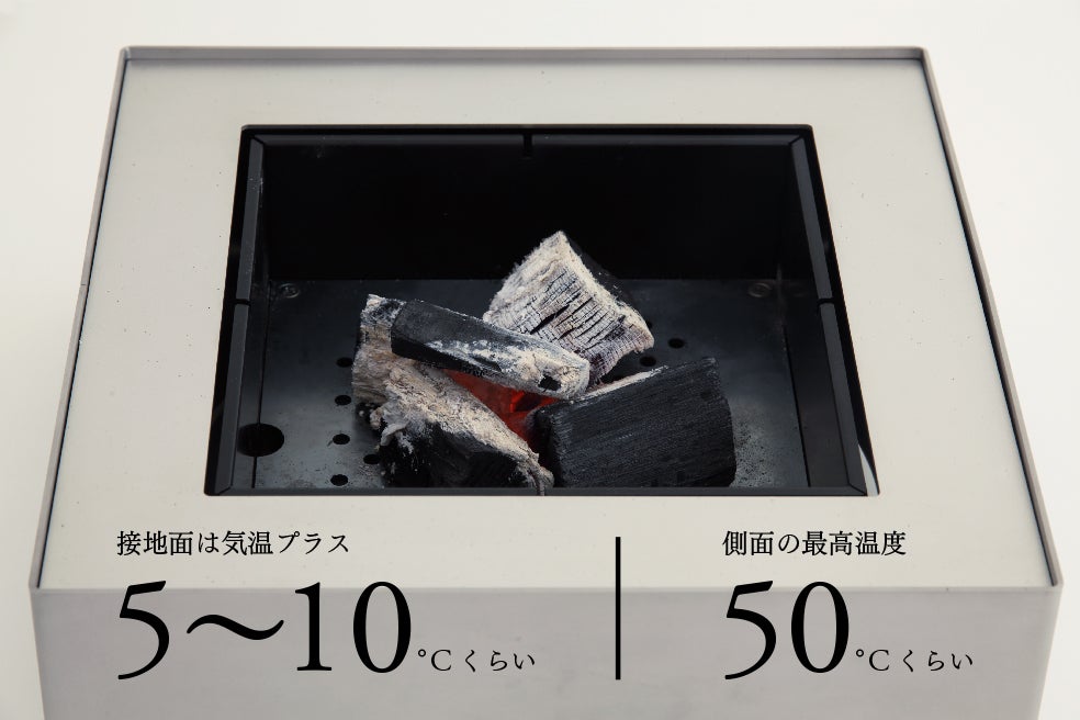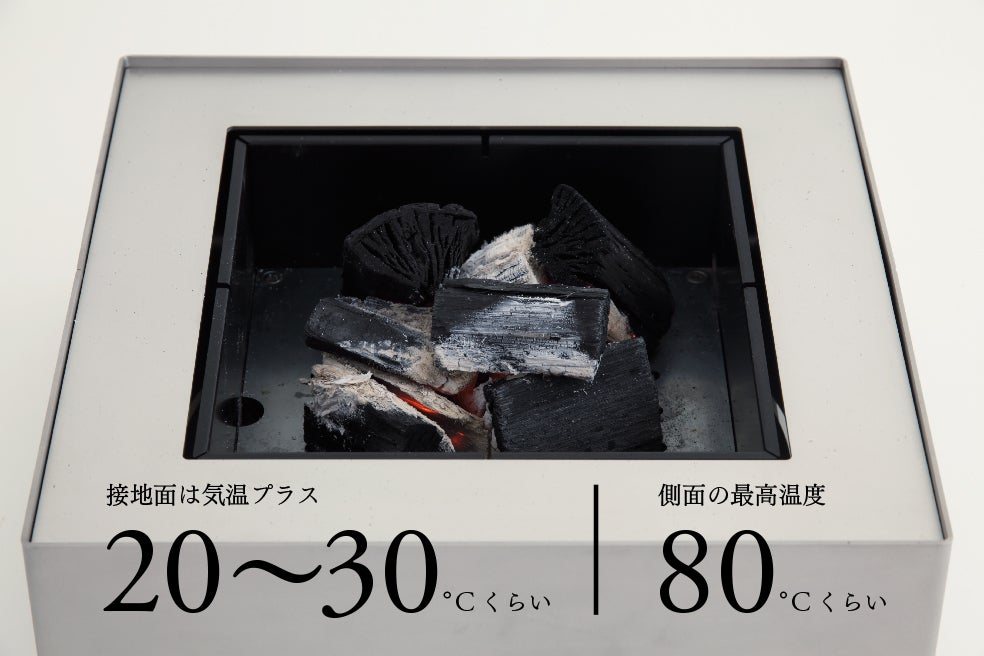 ただ炭自体は500°Cを超える温度で燃焼しますので、ある程度の時間、大量の炭を燃焼させれば火鉢本体は高温になります。炭を規定の最大量にまで入れ、数時間燃焼させた場合は、接地面は気温プラス20~30°Cくらい、側面は80°Cくらいまで上昇します。その点は十分ご留意のうえ、ご購入ください。気温と違い、物体の場合は50°Cでもけっこう熱く感じます。