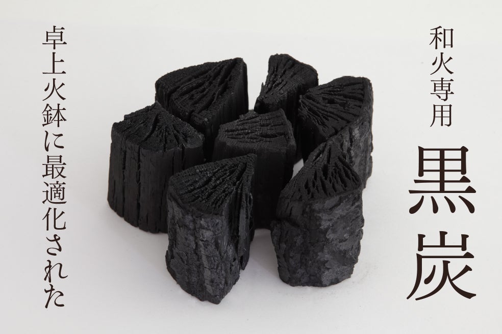 もしご自分で購入される場合は、黒炭をお買い求めください。黒炭とは、白炭(備長炭など)以外の炭の種類のことです。備長炭などの白炭は火付に時間がかかり、扇がないと温度が上がらないため、推奨しておりません。ホームセンターなどで売っている、6cmくらいに切り揃えられた岩手県産のナラ切り炭がオススメです。また黒炭であっても安価なものは臭気を発生させることがあるため、室内での使用に向いていません。