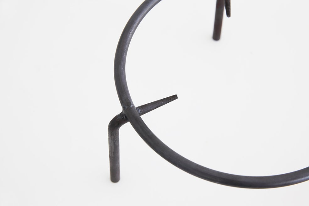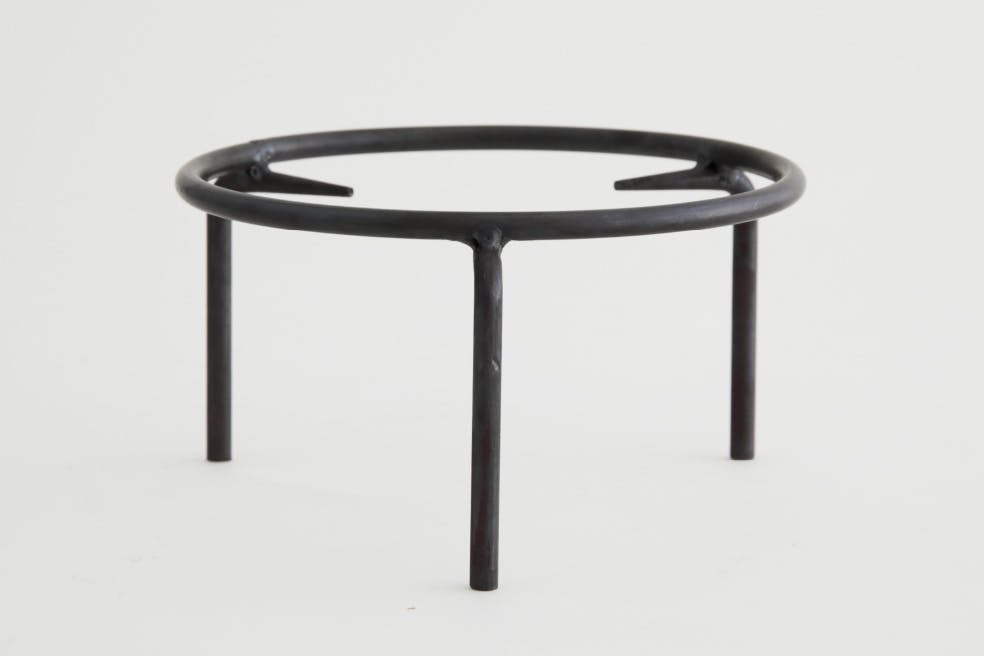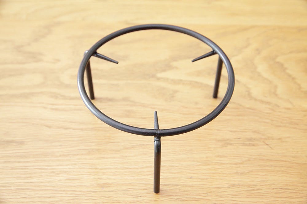 余計な要素を削ぎ落とし、シンプルに仕上げています。金属加工の歴史が長い新潟県燕三条にある製作所に依頼しました。脚上部を内側に折り返していますので、リングの口径145mmより小さいものも乗せることができます。こちらも火ばしと同じく、黒錆で表面を仕上げております。