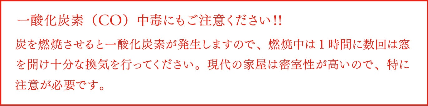 ※使い始めの時期に、燃焼中の炭と触れると黒染め特有の匂いがすることがありますが、健康上は問題ありません。また使っていくうちに匂いはなくなっていきます。