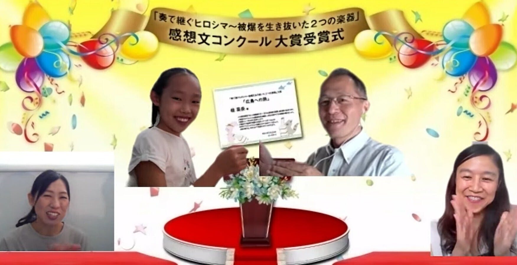 2021/09/28 07:239月23日、「奏で継ぐヒロシマ~被爆を生き抜いた2つの楽器」感想文コンクールの大賞授賞式を行いました。ご参加いただいたみなさん、ありがとうございました!今回は、Zoomの特別機能「イマーシブビュー(没入型)」を使い、実際にステージでお話しているような雰囲気を作りました。大賞受賞者の桂菜奈さん、お母さまの純子さん、選考委員の川崎哲さん(ピースボート/ICAN)、二口とみゑさん(HOPEプロジェクト)にご登壇いただきました。バイオリンが大好きで、毎日練習し、週に一度レッスンに通う菜奈さん。感想文のタイトル「奇跡のピアノとバイオリン」について、「戦争でたくさんの方が亡くなられたなかで、このふたつの楽器は、生き残って、私たちに平和の大切さを伝えてくれた(だからこのタイトルにした)」そして、「音楽や、その楽器の音色で、みんなに平和や幸せを伝えていきたい」と語りました。広島に行ったら「明子さんのピアノに触れて、戦争について学びたい。そしてもみじ饅頭も食べたい」と締めくくりました。選考委員の川崎さんは、たくさんの感想の中から菜奈さんの作品が選ばれた理由として、「楽器が生きているようだ」と表現をしたこと、「戦争なんておかしい」ということをストレートに主張したこと、「私たちがこうやって生きていることも奇跡だ」と理解させてくれたこと、などをあげました。二口さんからは、受賞せずとも素晴らしい感想文を書いてくれたみなさんへの総評が送られました。子どもだからこそ伝えられる素直で力強いメッセージ、高校生が説いた核兵器の恐ろしさや自身の体験を織り交ぜた主張、事実を知ることの大切さ。そして、参加したみなさんが「被爆ピアノ」ではなく「明子さんのピアノ」と表現してくれたことに喜びを感じた、と語りました。「コロナが終わったら、ぜひ広島に来てほしい」と呼びかけました。最後に、番組「パルチコフさんのヴァイオリン」を製作した広島市立牛田中学校PC放送部の3人からのビデオメッセージを紹介しました。広島名物から平和を学べる大切な訪問地まで、祝福と励ましの言葉に乗せて、コミカルに伝えてくれました。・・・・・広島原爆投下から76年の夏、このプロジェクトの一連のイベントはこれで一旦終了になります。あとは、コロナ感染状況を見て、大賞賞品である菜奈さんの「広島への旅」実施を楽しみに待つばかりです。その頃、NPT再検討会議、核兵器禁止条約第1回締約国会議も行われ、核兵器にまつわる世界情勢が大きく変わっているかもしれません。時代や世界が変わっていくなかでも、「明子さんのピアノ」と「パルチコフさんのバイオリン」がいつまでも変わらず、「平和の大切さ」を教えてくれる2つ楽器として、優しく美しい音色を聞かせて続けてくれることを祈っています。 もっと見る感想文コンクール大賞決定!「奏で継ぐヒロシマ~被爆を生き抜いた2つの楽器」を視聴して
