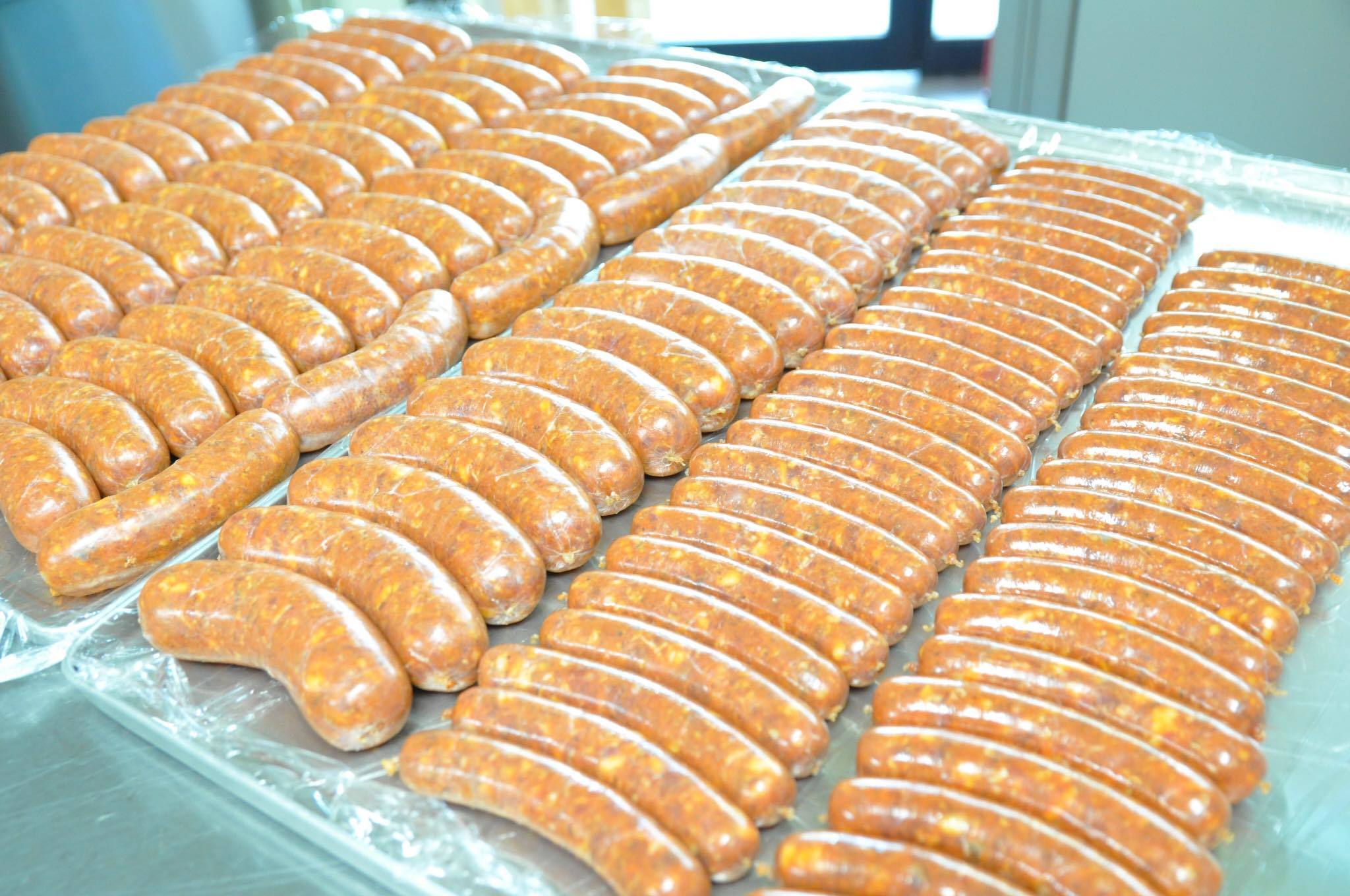 肉のカット、ミンチ、生地作り、腸詰め、形成までを手作業で行っており