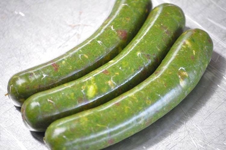 ↓現在開発中の酒粕を使った発酵ソーセージや、緑のソーセージ。