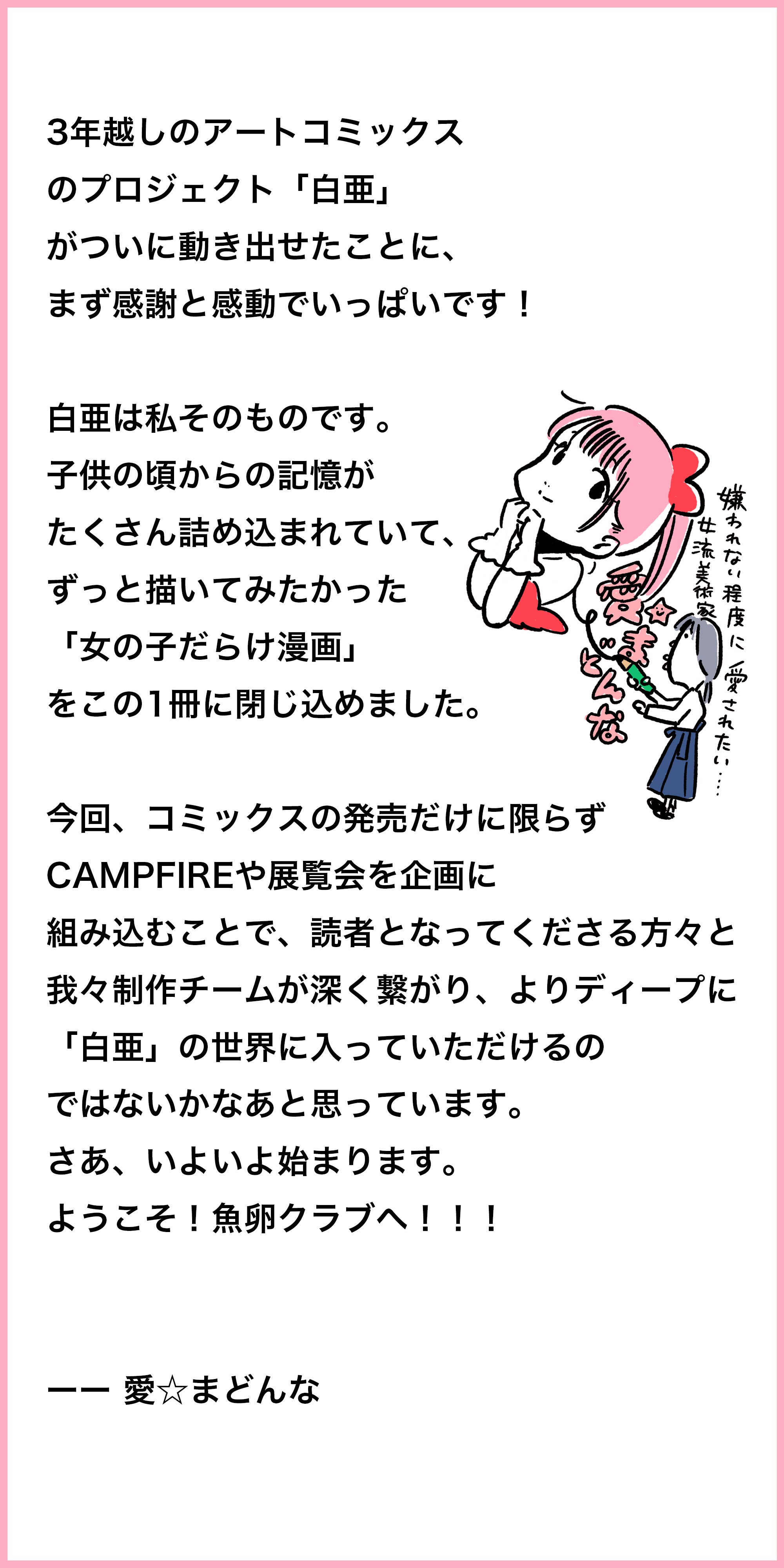 2019/09/13 17:30アートコミックス『白亜』第2刷発売!クラウドファンディング「【愛☆まどんな】初のマンガ作品「白亜」の展覧会を開催したい!」をご支援いただいた皆様のお力もあり、アートコミックス『白亜』第2刷を発売開始しました!9月11日より「白亜公式サイト」https://aimadonna-hakua.com/「愛☆まどんな公式サイト」https://aimadonna.com/にて発売し、Amazon他オンライン書店、各取り扱い書店でも順次ご購入いただけます。【2刷発売開始!】アートコミックス『白亜』ご購入方法実は増刷は6月の発売前に決定していたのですが、こだわった造本のため時間がかかっており、公式サイトやAmazon他オンライン書店では早々に売り切れとなってしまい大変お待たせしておりました。ぜひ周りのお友だちなどにも広めていただけますと幸いです![9/30 開催]愛☆まどんな × ゆうこす スペシャルトークイベント「アートって、かわいいだけじゃダメですか?」そして第2刷発売に合わせて、モテクリエイターゆうこすさんを迎えて、スペシャルトークイベントを9月30日に開催いたします!愛☆まどんな × ゆうこす「アートって、かわいいだけじゃダメですか?」https://aimadonna-yukos.peatix.com/大の〝愛ま〟ファンで、白亜掲載作品の購入を通じて生まれてはじめて「アートを買う」という体験をした、モテクリエイターのゆうこすさん。アートってむずかしくないし、知識も経験も何もいらない! 美しいと感じたものをただ描き、いいなと感じたものをただ見ればいいだけ!! アートコミックス『白亜』とそこに掲載された20点の絵画を題材に、アートへの敷居を65%は下げるスペシャルイベント(司会は編集柿内)です。日時:2019年9月30日(月) 19時〜20時30分 (18時30分開場)詳細+チケットのご購入は以下URLからお願いいたします。https://aimadonna-yukos.peatix.com/サイン入りコミックスが付いたスペシャルチケットもありますよ!白亜展に続いてまた魚卵クラブのみなさまとお会いできること楽しみにしています!改めまして、ご支援いただいたみなさま、本当にありがとうございました!そして、引き続き『白亜』をよろしくお願いいたします!白亜プロジェクトチーム一同 もっと見る