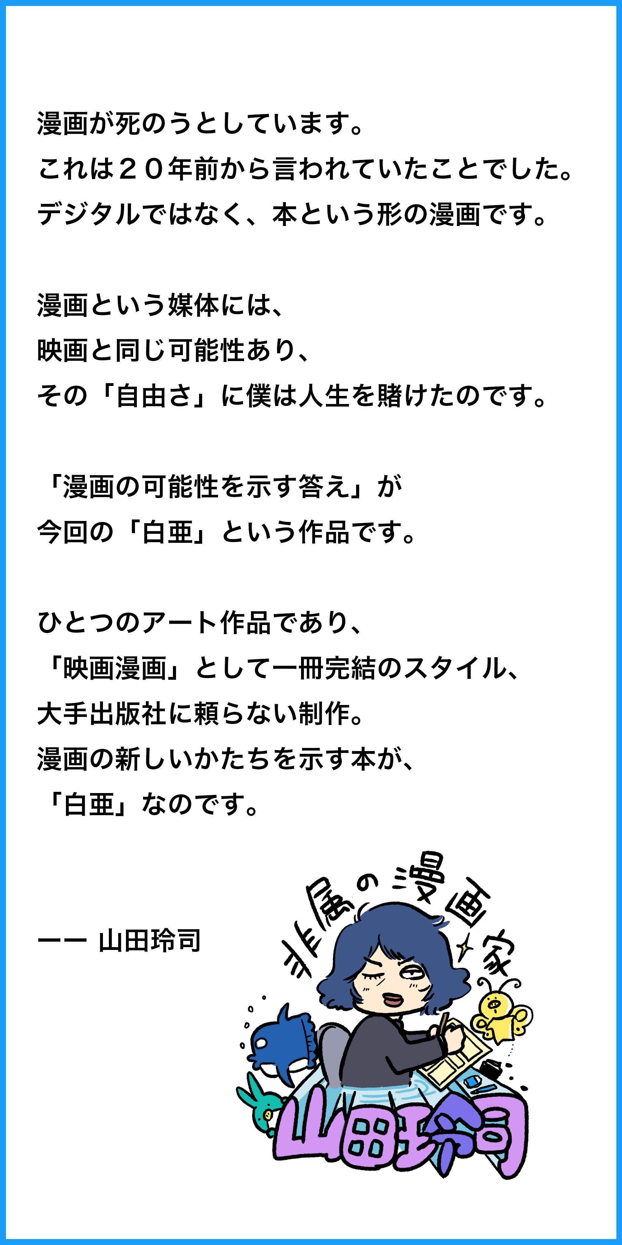 原作として「ネーム」(漫画の鉛筆での下書き/ラフ)を担当した山田玲司が、『白亜』制作で描いたネーム1話分と、一部のページを直接彩色したもの! 10部のみの「山田玲司版 『ウラ☆白亜』」を制作します。本屋にもどこにも出回らない 超貴重な1冊 に、サインを入れてお届け!