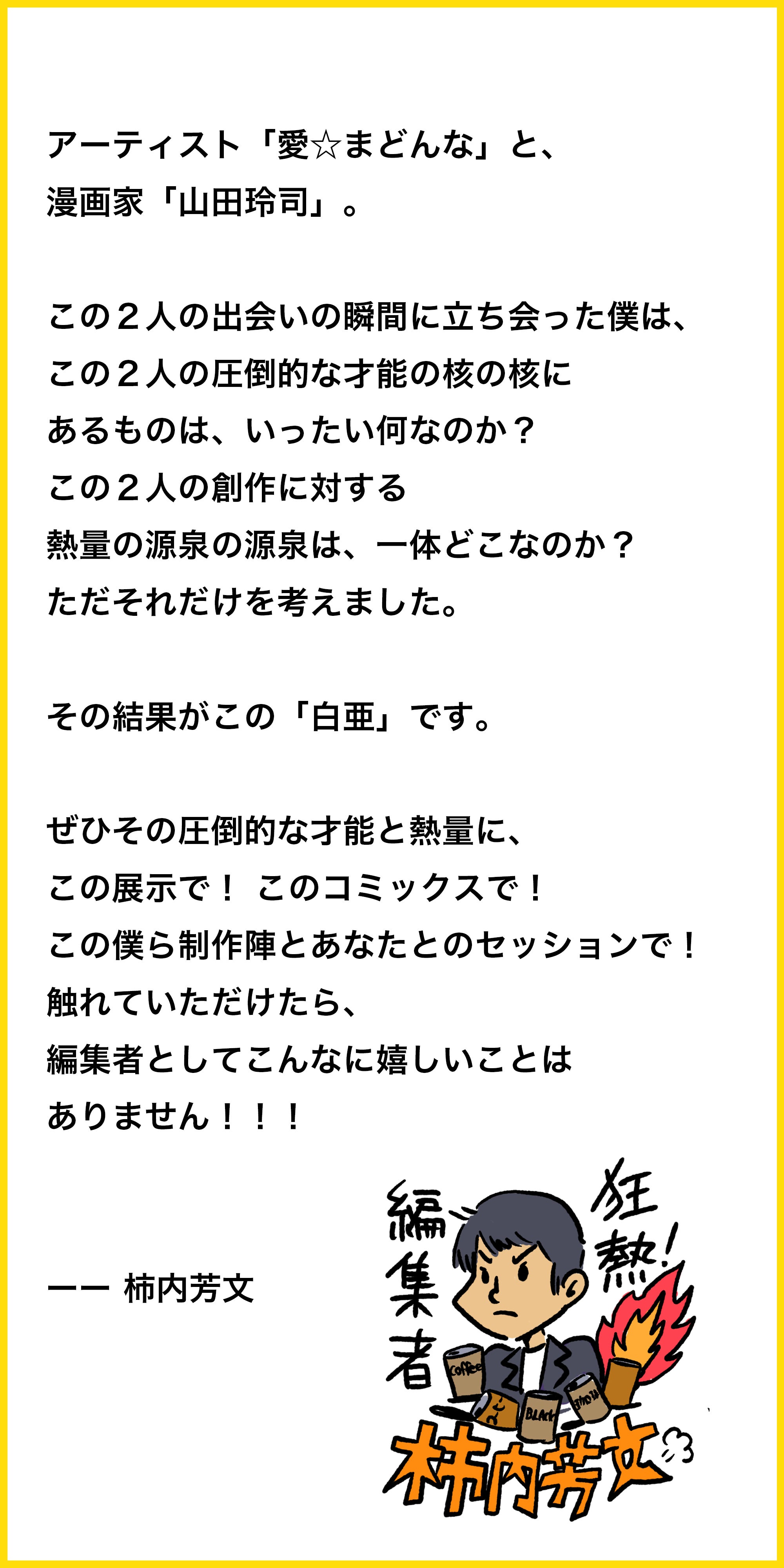 その発売に先立ち、アーティスト「愛☆まどんな」 × 漫画家「山田玲司」 × 編集者「柿内芳文」によるグループエキシビジョン「白亜展」を企画しました。