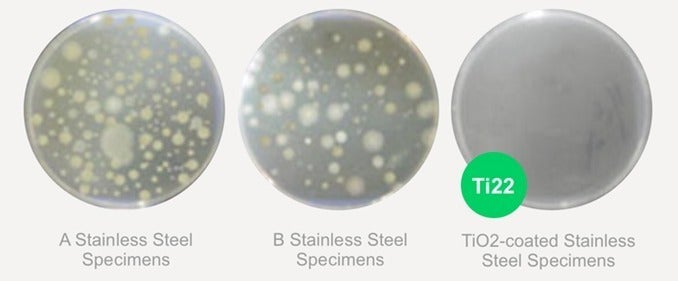 以下は、ペトリ皿に一般的なステンレス鋼標本2種類(AとB)とチタニア(TiO2)をコーティングしたステンレス鋼標本を置いて24時間経過した時点での黄色ブドウ球菌と大腸菌コロニーの繁殖状態を示しています。チタンの抗菌力の強さは一目瞭然です。