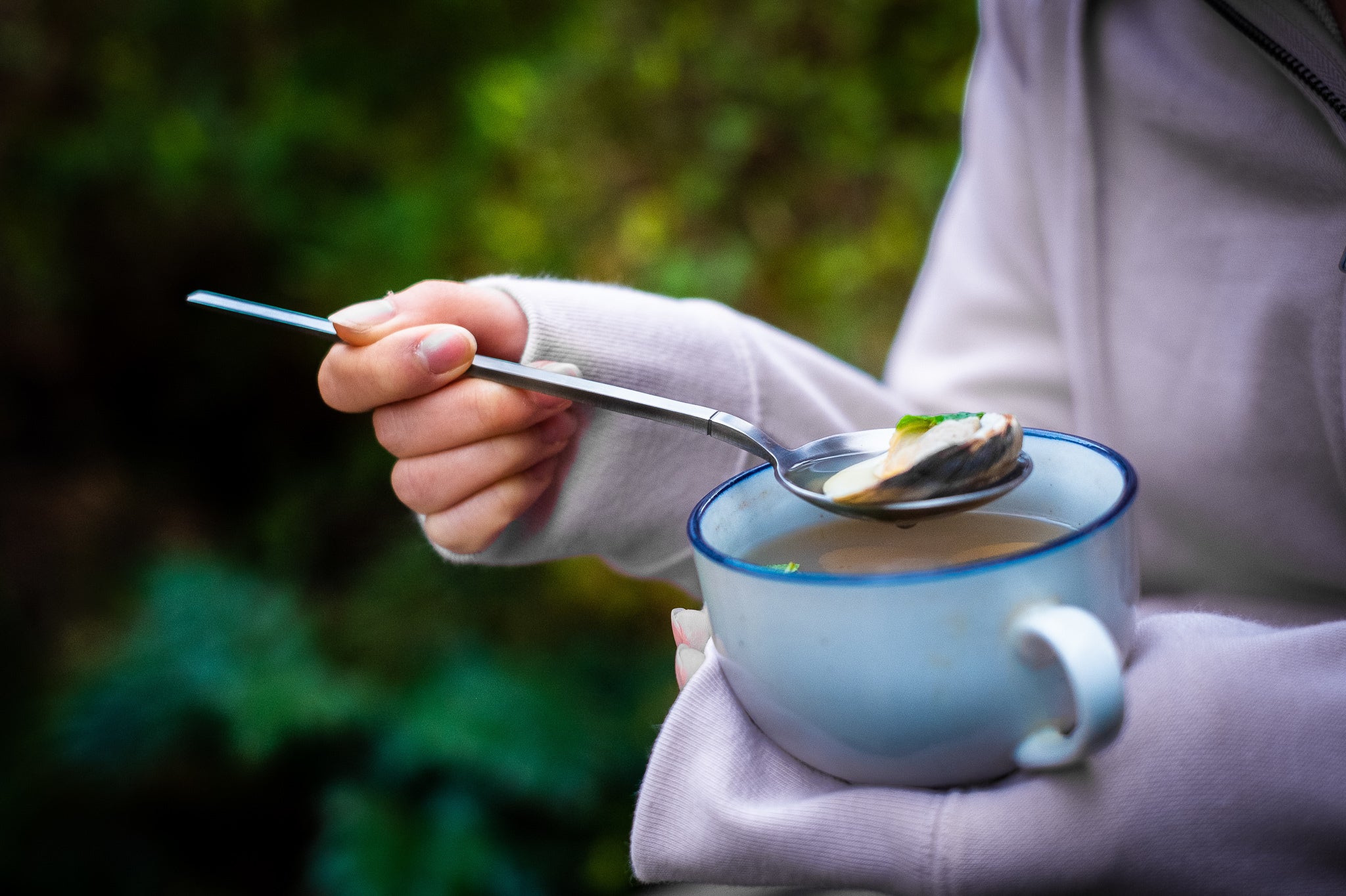 熱伝導率が低い:ステンレスや他のカトラリー素材と比べて、チタンは熱伝導率が極めて低く、室温から変化しにくい性質があります。「Ensō」のスプーンなら、熱いスープやコーヒーにしばらく浸していても熱くならないので、手を火傷しそうになることはありません。