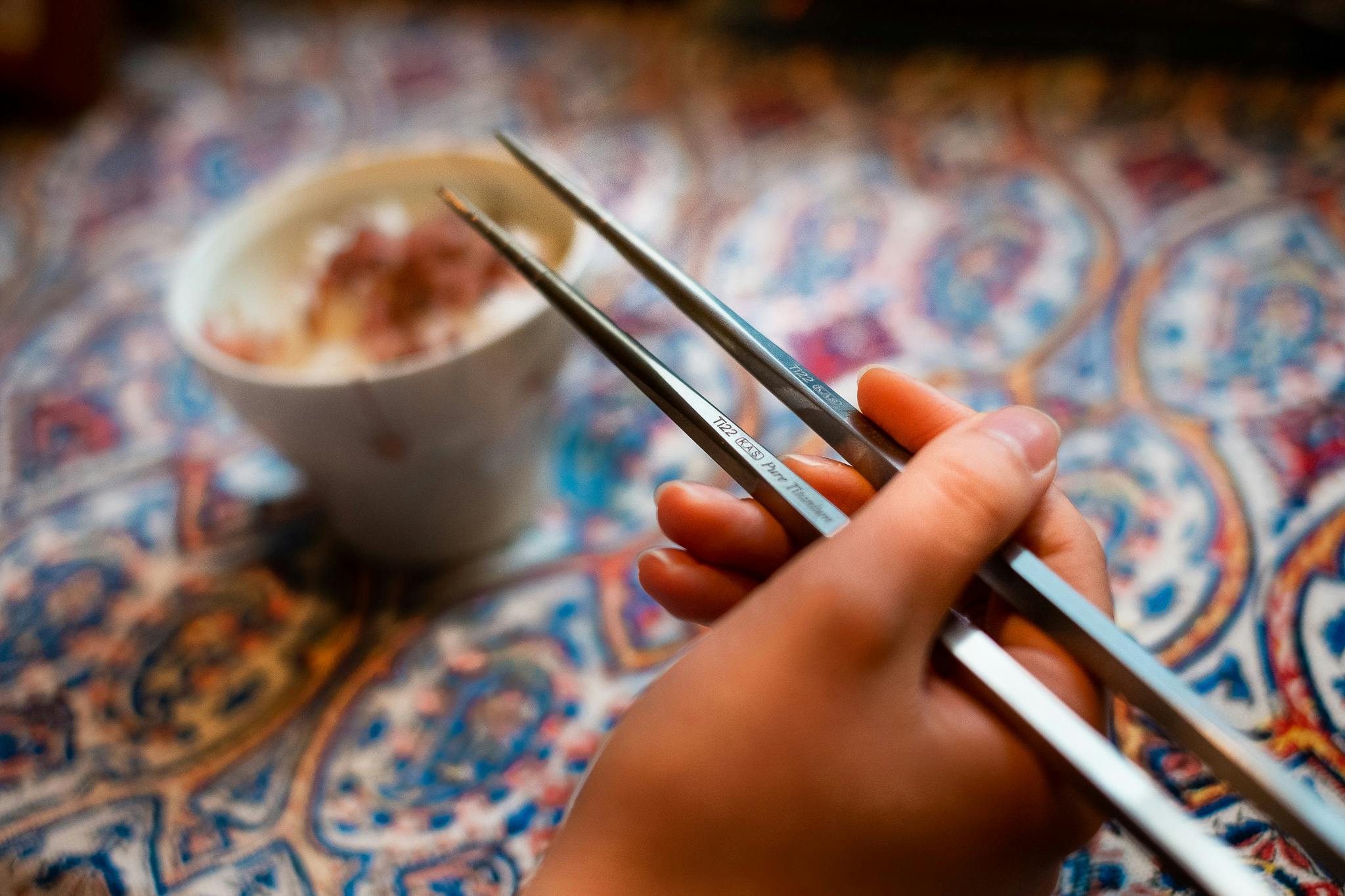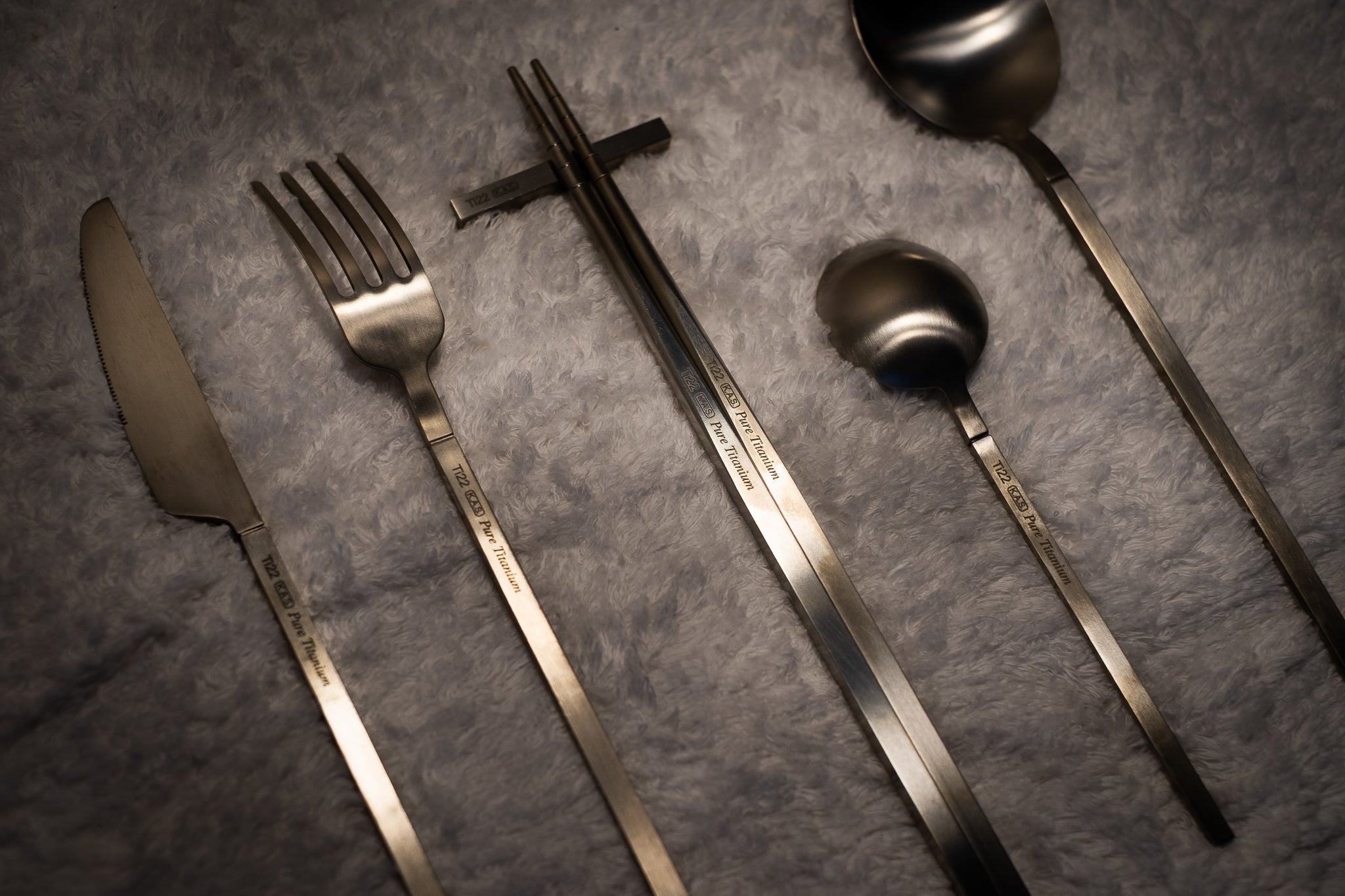 Ti22は、箸を使う文化も視野に入れ、純チタン製のエレガントな箸と箸置も考案しました。金属とは思えないほど手に優しく馴染む素材感は、金属の箸のイメージを一新してくれます。チタンならではのシックな素材感が活きる一膳を、食卓に加えてみてはいかがでしょう。