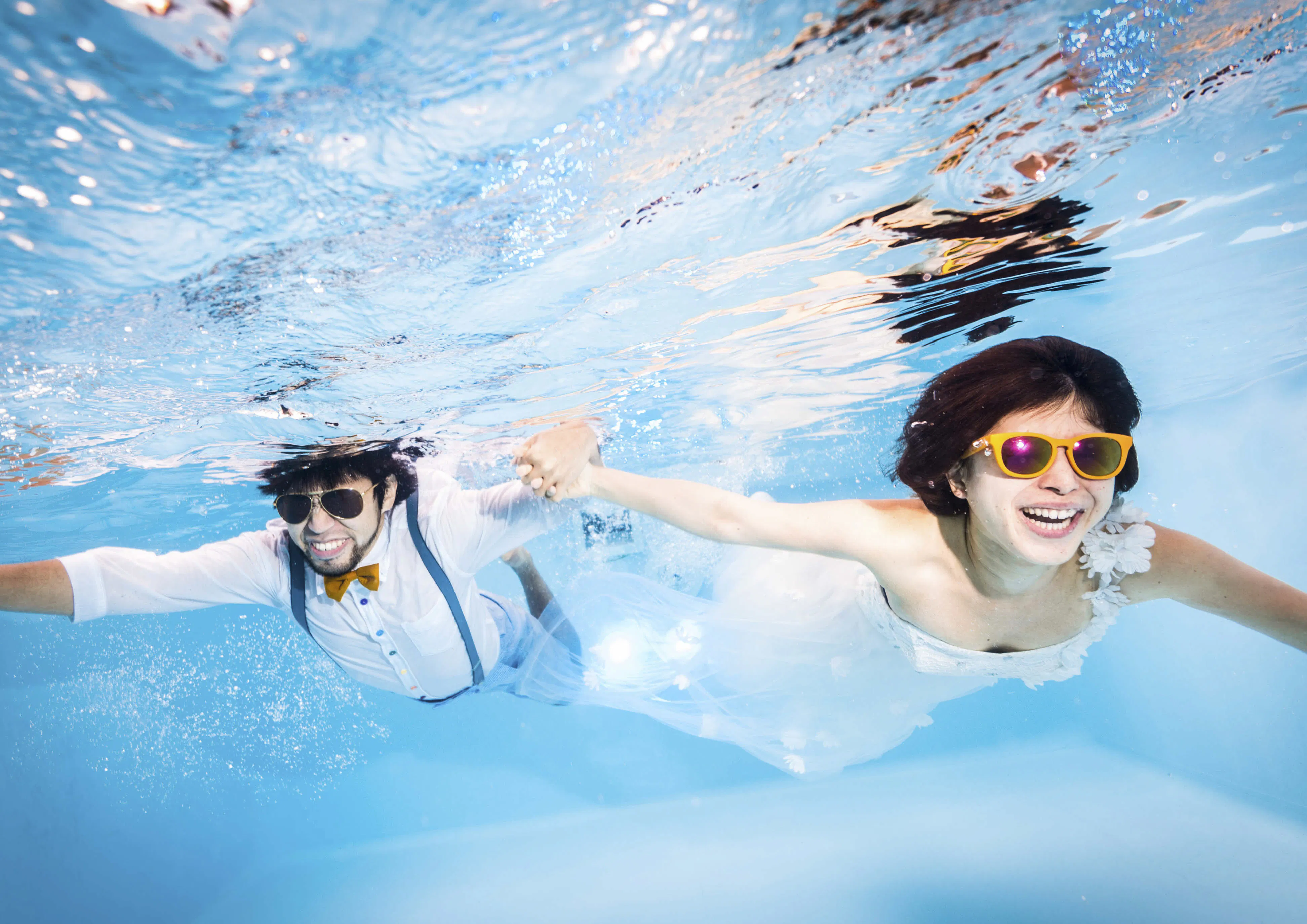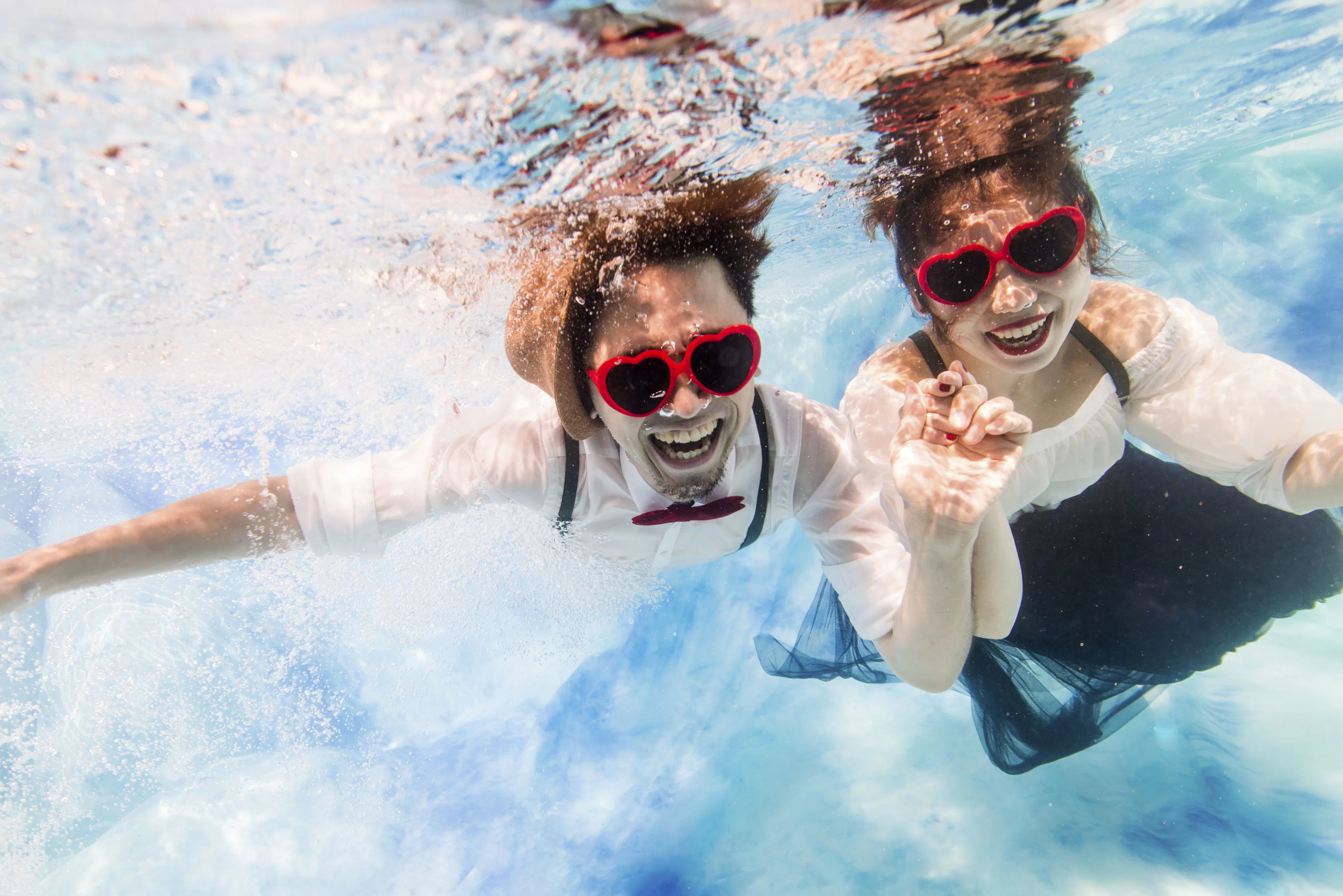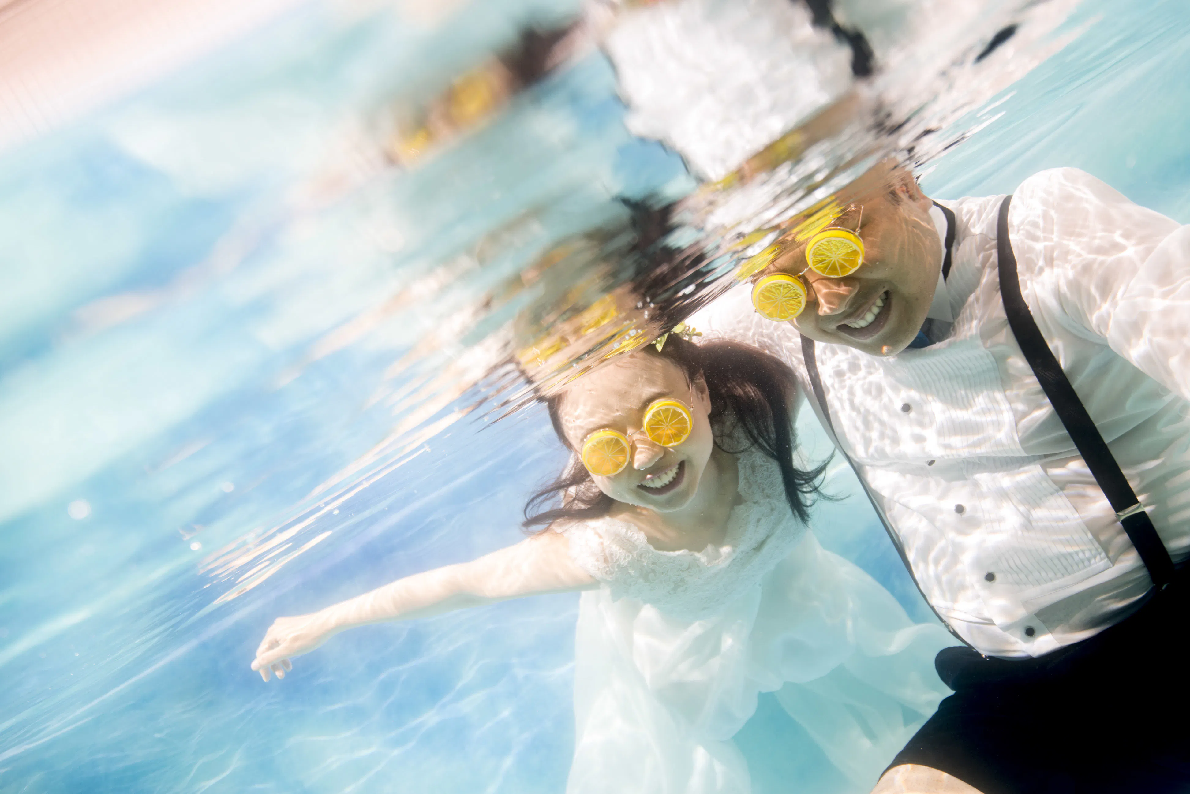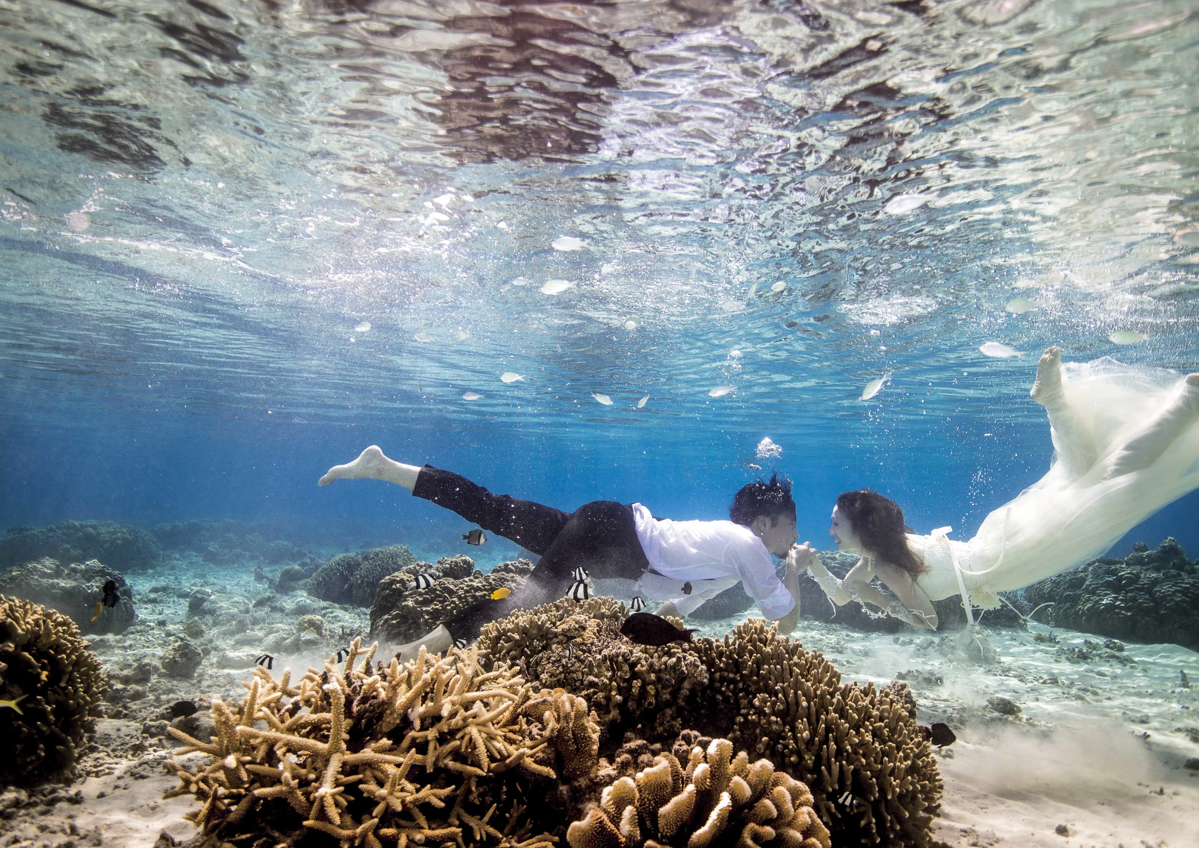 スイマーやダイバーのカップルが思い出の水の中で撮影出来るように