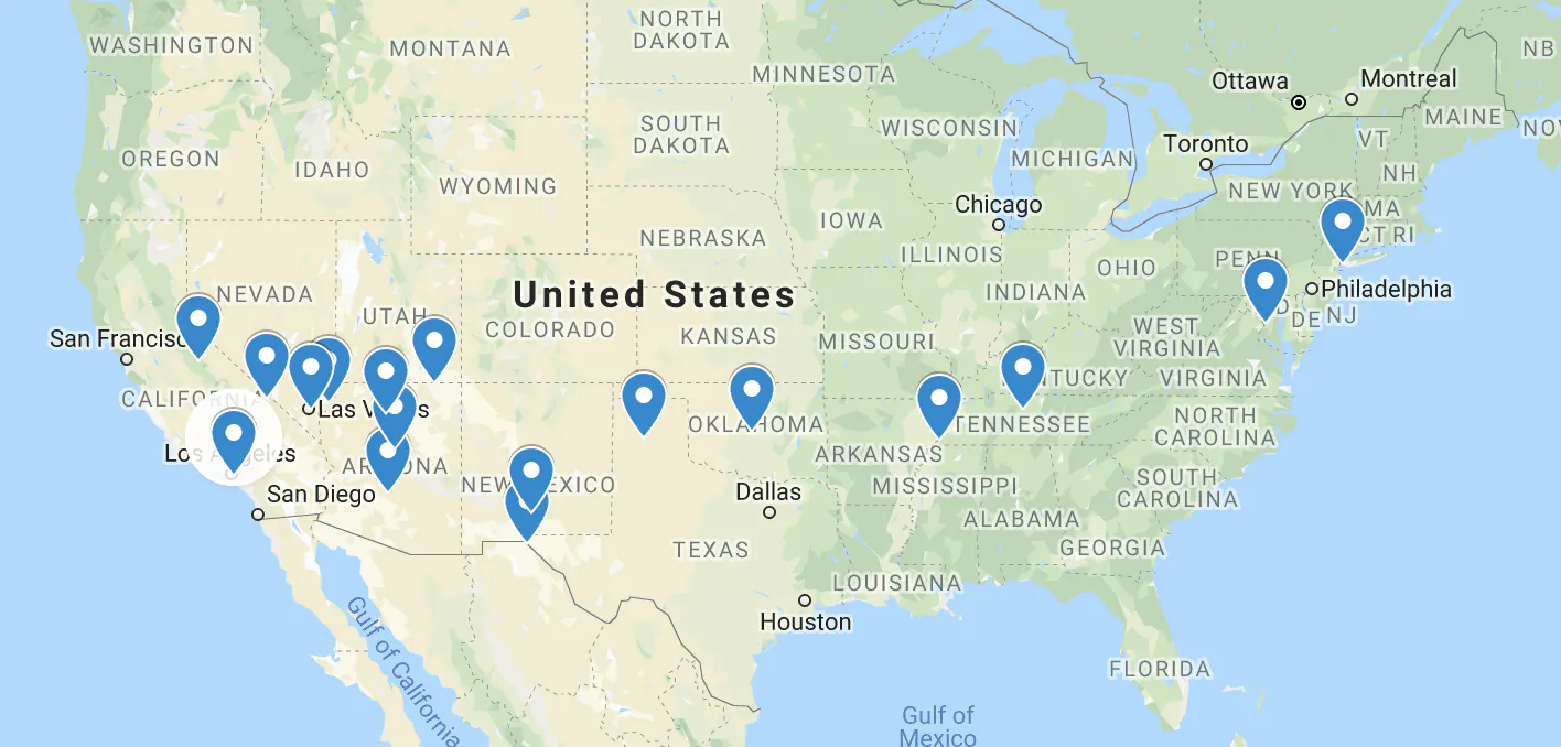 1. ニューヨーク 2.ワシントンDC 3. ナッシュビル 4. メンフィス 5.オクラホマシティ 6.アマリロ 7.エルパソ 8.フェニックス 9.グランドキャニオン 10.バレーオブファイア 11.ラスベガス 12.デスバレー 13. ヨセミテ 14. ロサンゼルス 15. サンディエゴ 16. ロングビーチ
