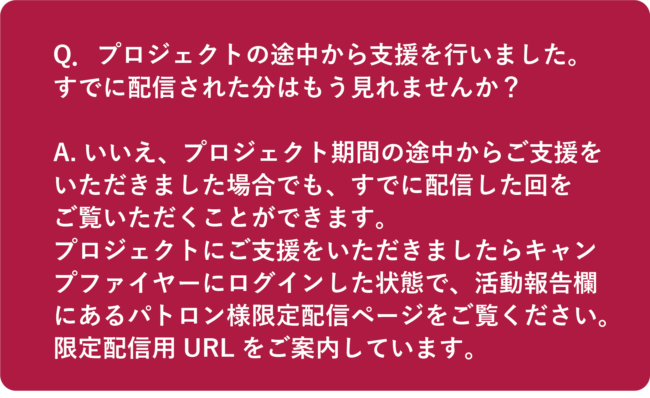 このプロジェクトはAll-in方式を採用しています。プロジェクトは皆様からリターンの募集を行いながら同時に進めていきます。計3回の番組配信はプロジェクトへご支援をいただきました皆様がご覧いただけます。(番組前半は公開配信のためどなたでもご覧いただけます)また、期の途中からご支援をいただきました場合であっても後半の限定配信をご覧いただけます。