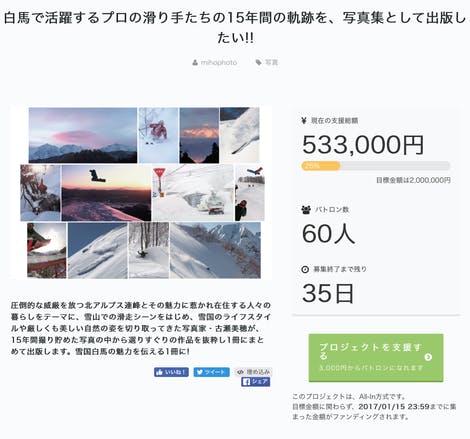 2016/12/13 21:31表題の通りですっ 今回、2作目の写真集を制作するための資金調達の方法の一つとして利用させていただいている「クラウドファウンディング」で、支援者が60名、集まった支援金は50万円を超えました ご賛同いただきました支援者のみなさま、本当にありがとうございます 週末は友人の結婚式があったり、子供たちとの時間を過ごしたりしながら少しずつ制作を進めている今回の写真集作成プロジェクト。 フィルムで撮影していた時代から、約15年間に渡り撮り貯めた膨大な数の作品たち。 (このまま私のPCや押入れの中に眠らせていたくない!)と一念奮起して写真集制作を始めたのですが・・・ 「本を制作は、甘くはない 」 ということは前途の通り。 中でも「資金調達」という動きは、これまで大きなリスクを背負わずにゆる〜くぬる〜く生きてきた私の写真家人生で初めての経験で、おそらく今後の人生にも大きく影響する経験になることだと思います。 その手段の一つとして選んだ「クラウドファウンディング」という方法。ITにはあまり長けていない私自身がその名前を聞いたのは数年前のことで、また近年友人の写真家がこの方法を使って夢を実現させており(もちろんそれだけではないはず!!)、資金調達の手段としては気になる方法でした。 けれど実際に自分が挑戦するとなると... 目の前にいない相手に対してどれだけ自分のプロジェクトをわかりやすく説明して賛同していただくか、最初は全く不安だらけのスタートでした。 しかも、自分の夢の実現のためにインターネット経由でお金を乞う姿勢にも正直少し抵抗があり、「だったら先行予約販売をすればいいんじゃないか。」と思ったり。 それが、プロジェクトを相談して賛同してくれた周りの仲間達や、ITに強い協力者のおかげでなんとか私自身も「クラウドファウンディング」の仕組みを理解し、挑戦してみようと思えたんです。 今回私が資金調達の方法の一つに「クラウドファウンディング」を利用することにした理由は ・ 年内に写真集を発行する!と一念奮起した(9月初旬)ものの、なかなか制作が大変でどんどん時間がなくなってしまったこと ・ 先行予約販売用のサイト、及び支払システムを作る時間と技術がなかったこと ・ プロジェクトに賛同し、ご支援していただける方たちが支援してくれた瞬時にメールで連絡が入ること ・ ご支援いただける方からの応援メッセージを受け取ることができること ・ ご支援に対するリターン(お返し)ごとに、支援者の名前(私が使っているシステムではニックネームのみですが・・・)が分かること ・ 直接お互いに連絡先を知らなくても応援のメッセージやご支援をしていただくことができること ・ 目標金額や達成までの期日などのスケジュールを管理してくれること などなど、私一人の力では到底(大変!で)できないことを代わりにやってくれる、とても便利なシステムだったからです。当然手数料はかかりますが、上記を全部一人でやるとなると、写真集の制作どころではありません まるで「クラウドファウンディング」の宣伝をしているようですが(笑) 時代は便利になったな、と。 「"このボタンを押したら・・・(詐欺に合うんではないか)"と思ったらなかなか先に進めなくて。」と数人の同世代から連絡をいただいたりということも、あります。 確かに、私の世代(40代)ではまだまだこのようなシステムに対して懐疑的であることも事実ですし、おそらく私もそんな一人です。顔を合わせて話したいタイプ でも、すでに50名を超える支援者の方々から温かいメッセージをいただき、その言葉のおかげでPCの前に一人で篭りがちな編集作業も前へ前へと進んでいます。 「え〜っ!こんな人まで私のことを… 」と考えながら涙して作業がちょいちょい止まりますが 編集作業は最終段階を迎えました。 ただいま、300ページにわたって作ったレイアウトページを、写真の差し替えやら、バスッと写真を削除されたり などしながら完成に向かっております。 当初からの目標だった、年内中の発刊は、残念ながら、断念することになりました。 最速で、年明けの連休前には発刊しようと、現在いろんな方々の協力を経て頑張っています。 でも!!もう一つの目標、3000部の発刊はぜひ実現したい そして!3000部の全てが世界中の雪山が大好きな人のお手元で繰り返し鑑賞していただけたら… 引き続き、皆様の応援をよろしくお願いいたします。 写真集を楽しみにしてくださっている方には、今しばらくお待ちください。 また、この活動にご賛同いただける方は、ぜひ、ご協力をお願いいたします。 クラウドファウンディング http://camp-fire.jp/backers/14542 もっと見る