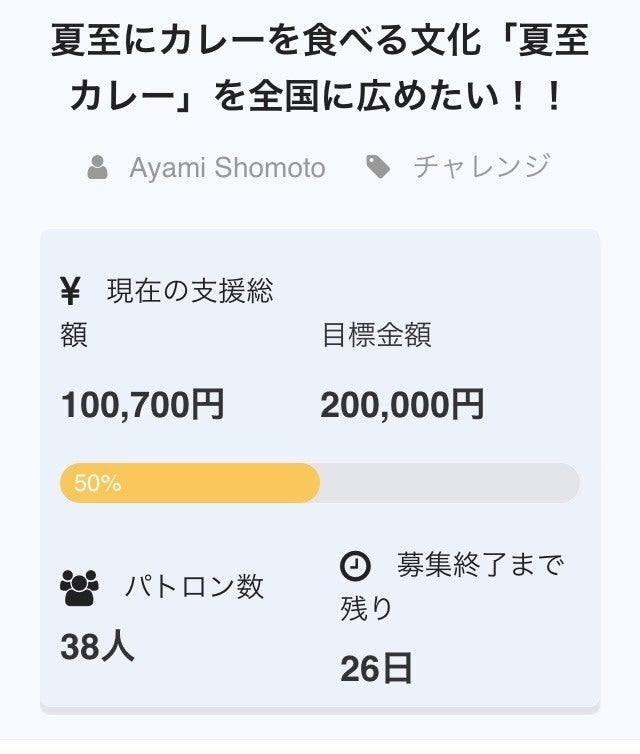 2019/05/15 01:11みなさまのおかげで、公開後16時間で目標金額の50%を達成することができました!!ありがとうございます…!!今日は仕事しながら携帯が気になって気になってしょうがなかったです…笑通知のメールが絶えず鳴り続け、開いたら「あっ…この子から!この方からも…!!」と嬉しい1日を過ごさせてもらいました。応援メッセージや沢山のリツイートもありがとうございます。ひとつひとつ確認させていただきます。やはり夏至カレーのパワーってすごい。語呂も良いし、なんだかワクワクしてしまう。私はきっと夏至でもカレーでも無くても良いんだろうけど、出会っちゃったし、ワクワクしちゃったんだから、これは見逃せない。この楽しみをシェアするために、夏至まで頑張って参りたいと思います。どうぞよろしくお願いします!円卓 庄本彩美 もっと見る